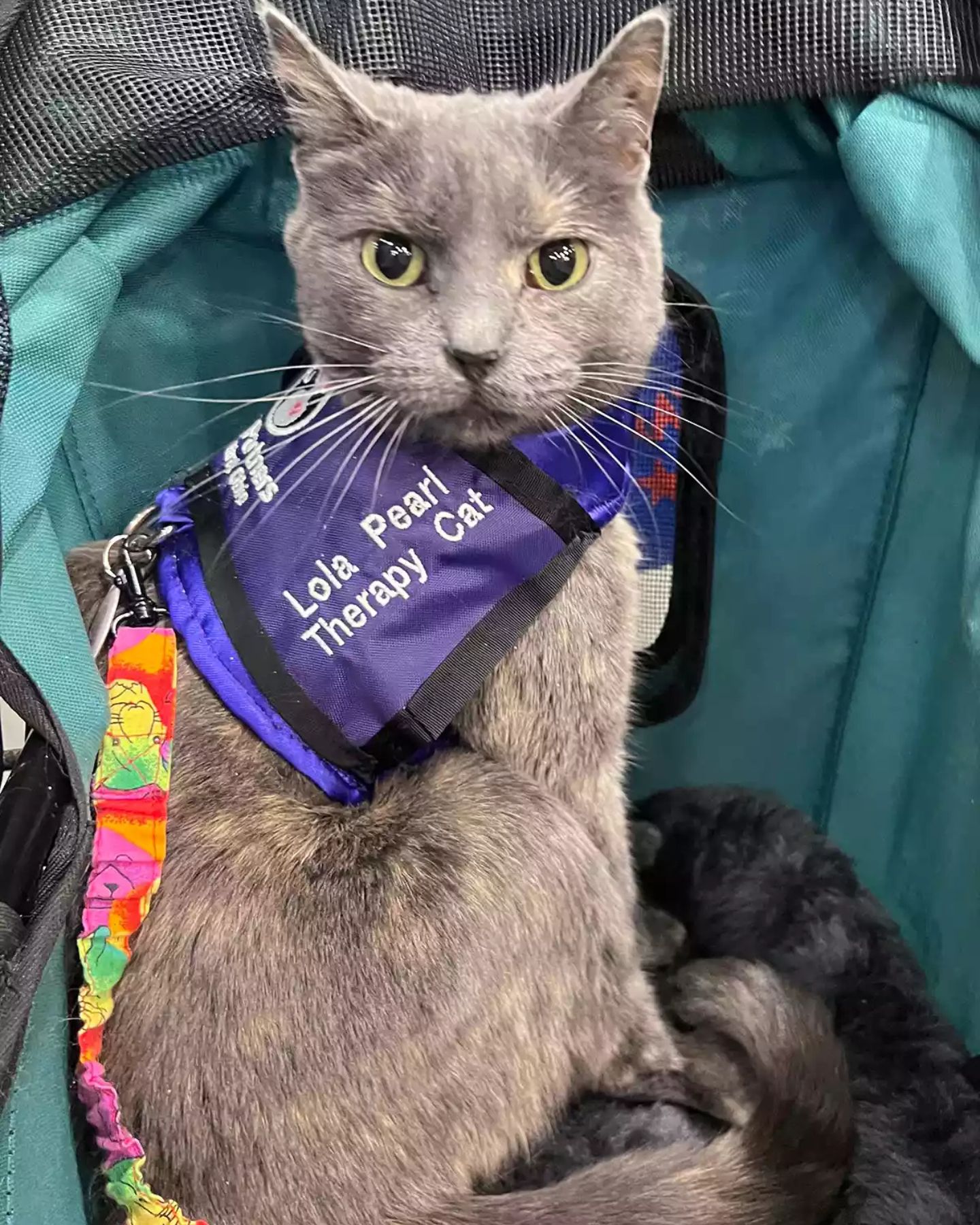 It didn’t take long for Mengel to see that Lola Pearl’s gentle and affectionate personality made her perfect for therapy work. Soon after, she officially registered her as a therapy cat with Pet Partners.