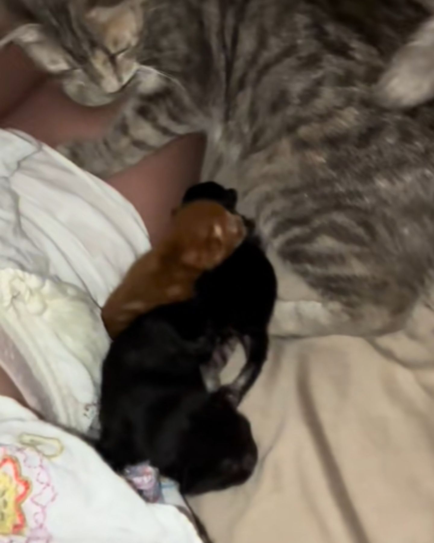 At first, she could not believe what she was seeing. Her cat was carrying her kittens, one by one, right into the bedroom. By the time she realized what was happening, there was already a pile of tiny babies snuggled up on her bed.