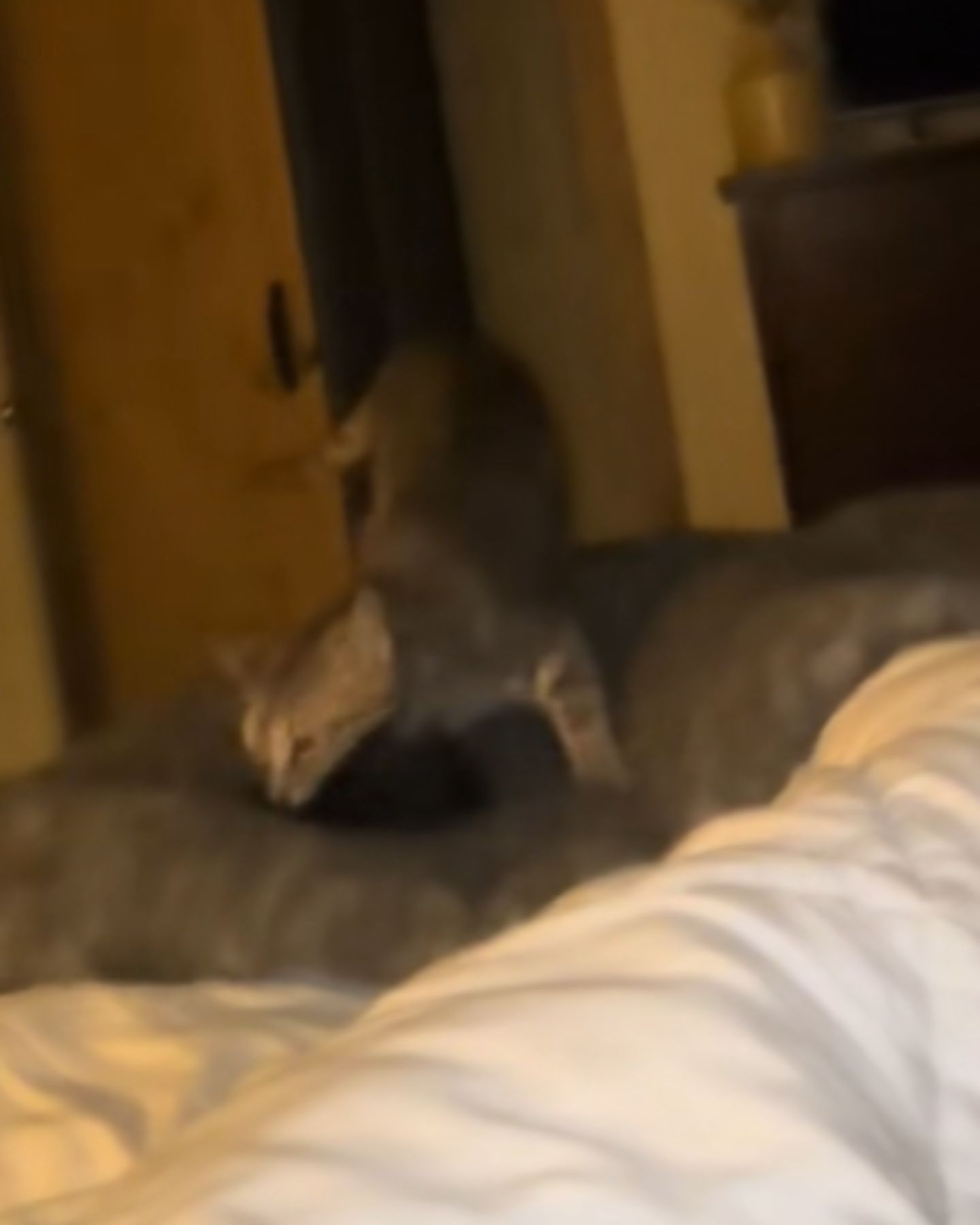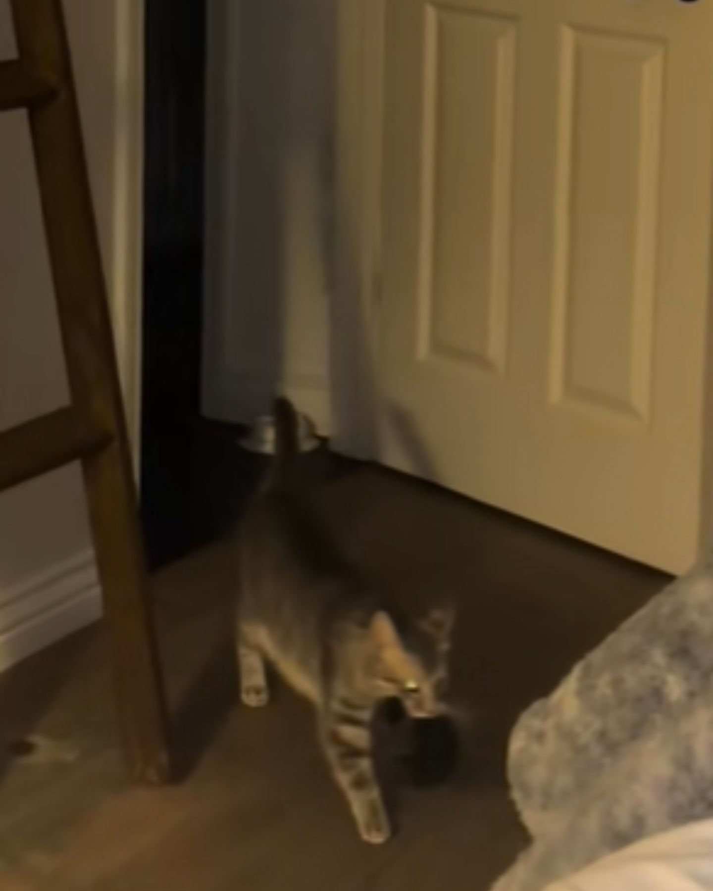 The clip starts with the owner settling into bed, ready to unwind after a long day, when suddenly her cat walks in carrying something small and furry.