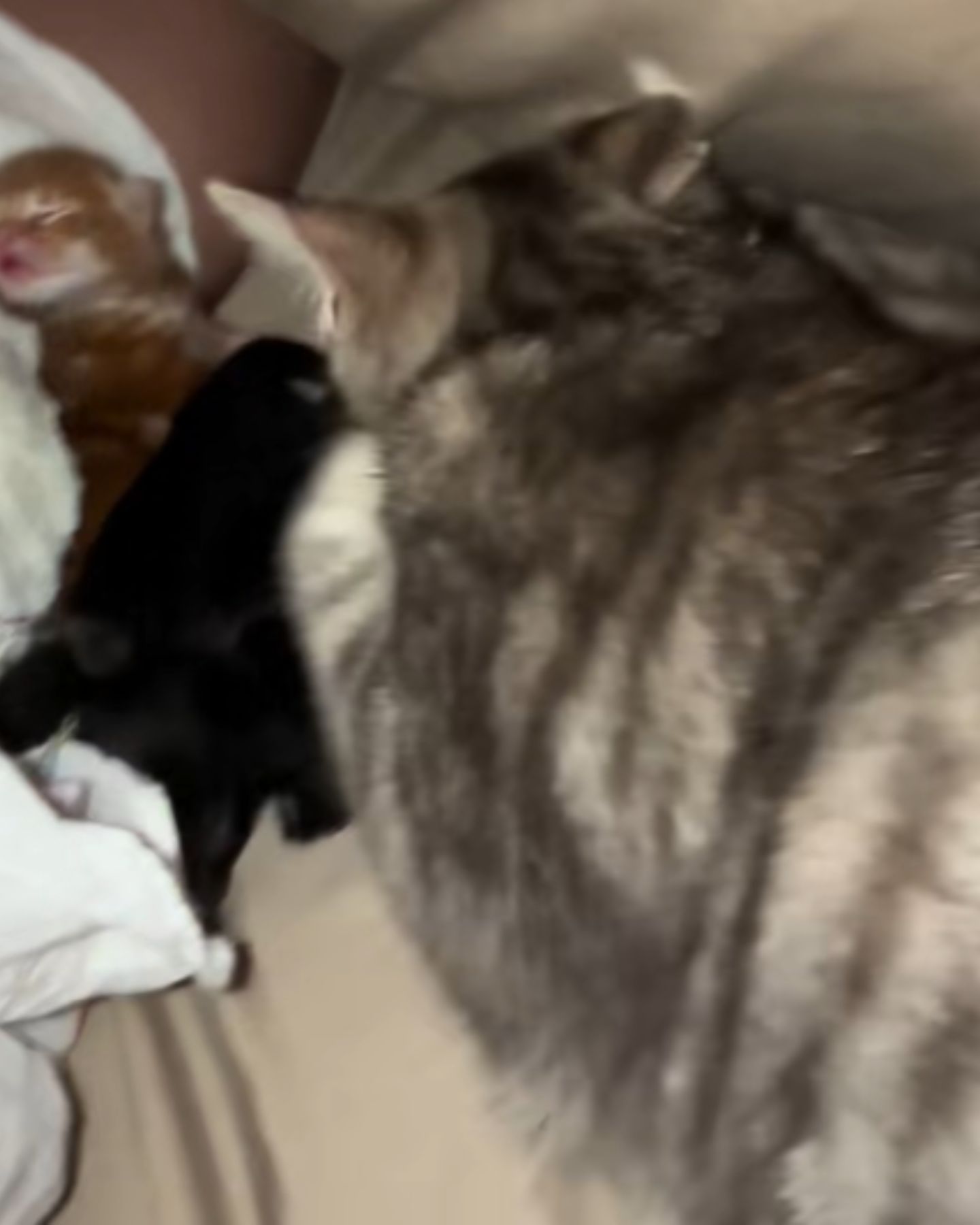 In the clip, the cat proudly climbs onto the bed after bringing the last kitten in, gets them all tucked in safely, and then nestles right beside them.