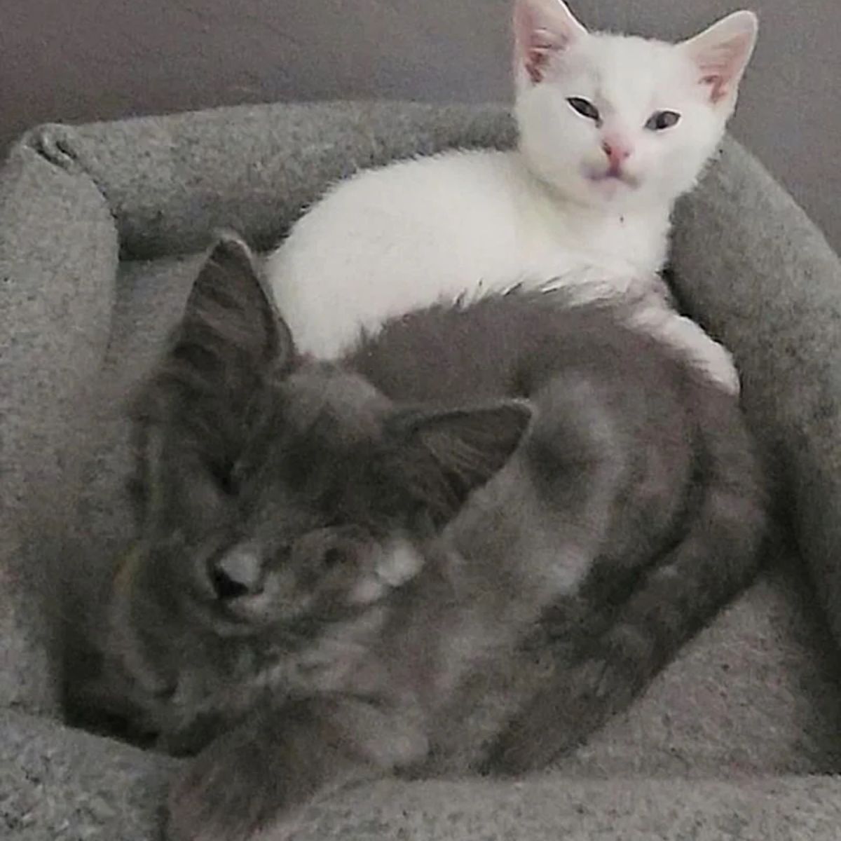 As soon as they arrived at their foster home, Baymax curled up in a soft bed with her tiny kitten pressed close.