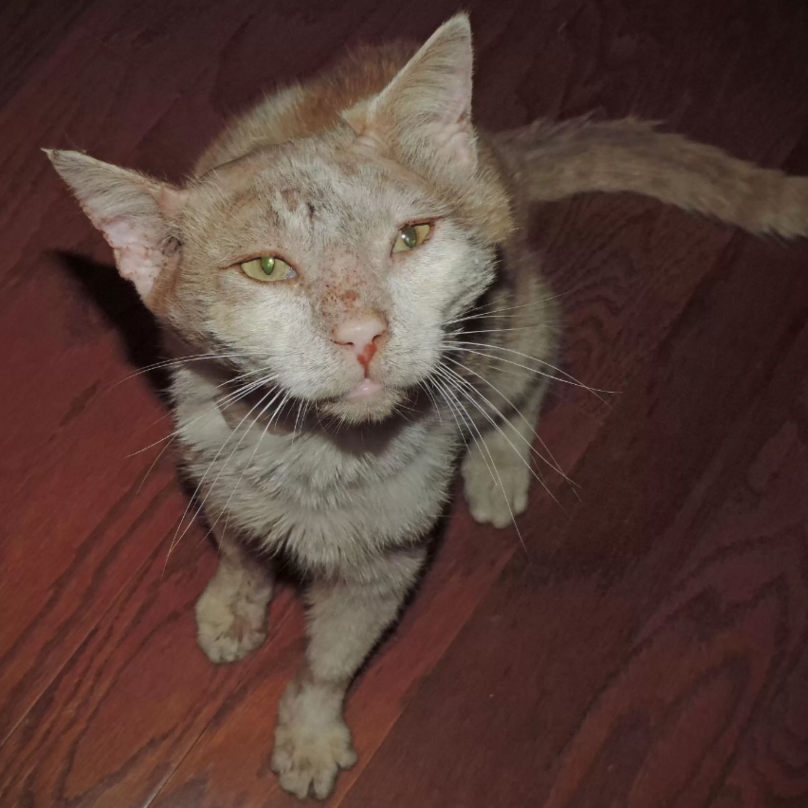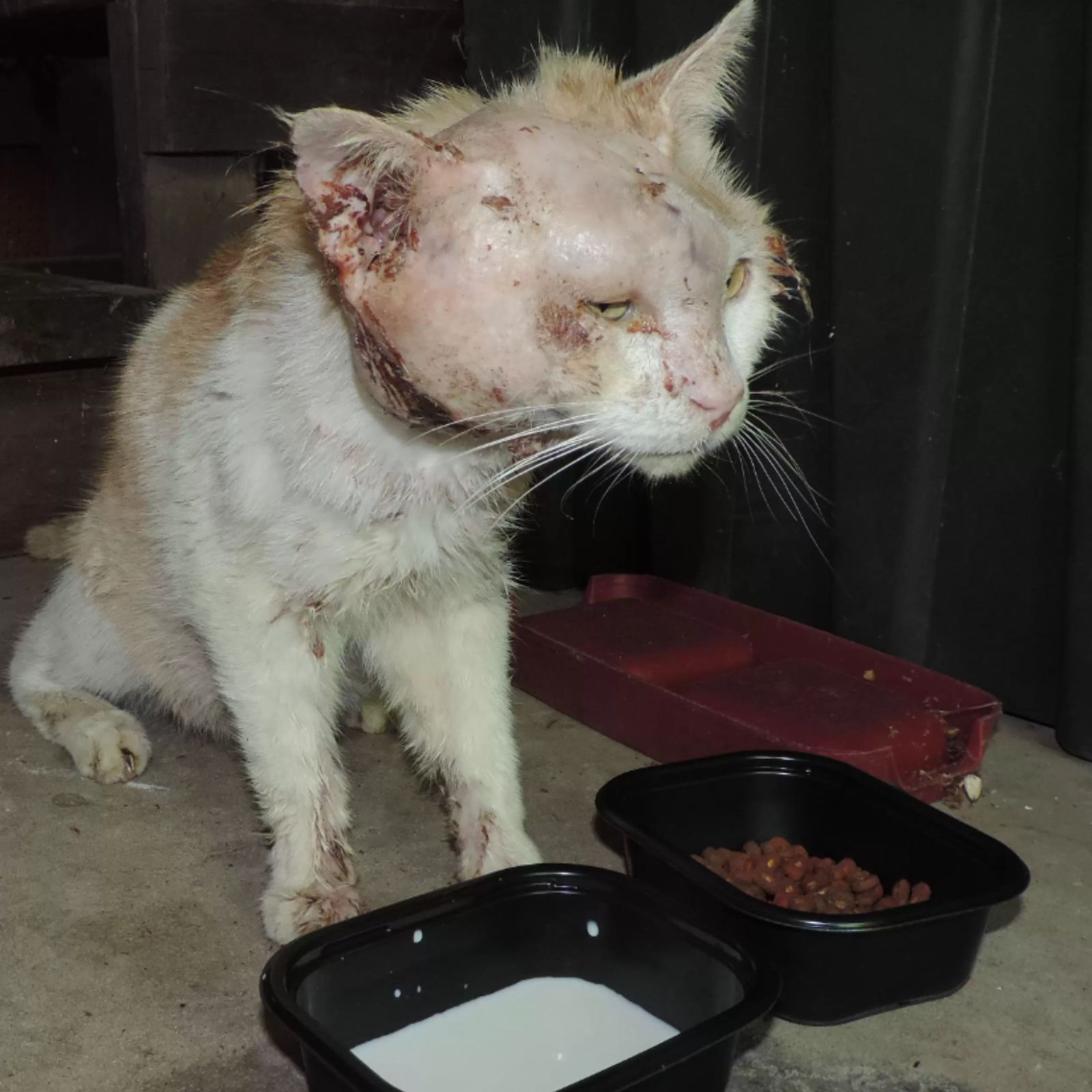 Battle Cat had countless puncture wounds across his body, with the worst ones on his face, now severely infected. He had a ruptured eardrum, a high fever, and eyes almost swollen shut.