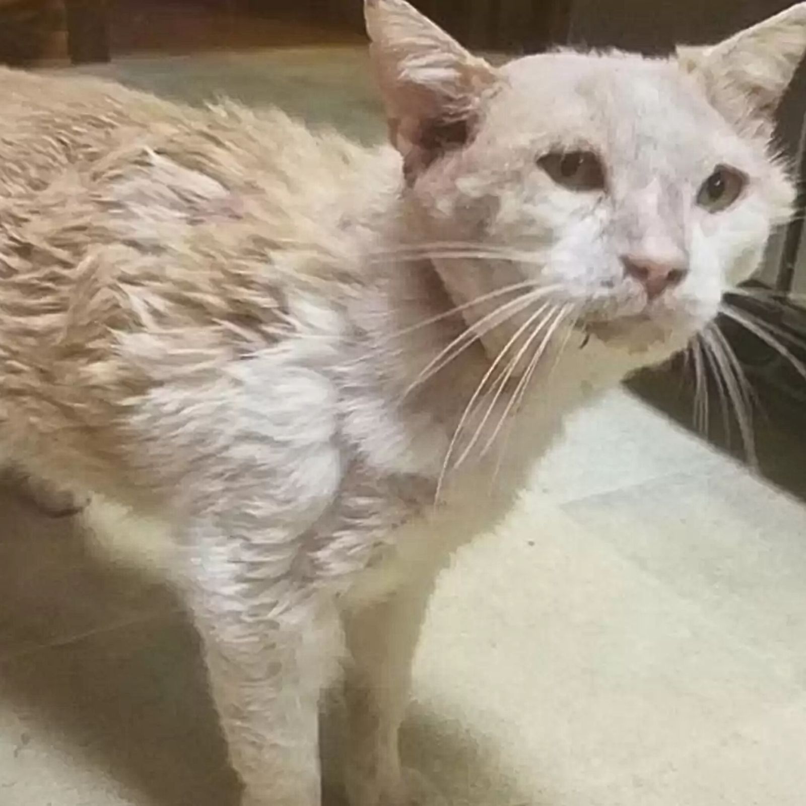 On top of that, his fur was patchy and riddled with fleas and ticks. Despite his dire condition, the vet remained optimistic, believing that with proper care, Battle Cat could make a full recovery.