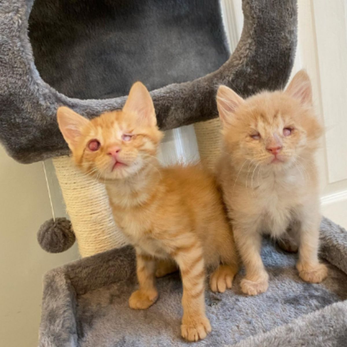 The two tiny ginger boys were only about four weeks old when she rescued them, and their little eyes were badly infected.