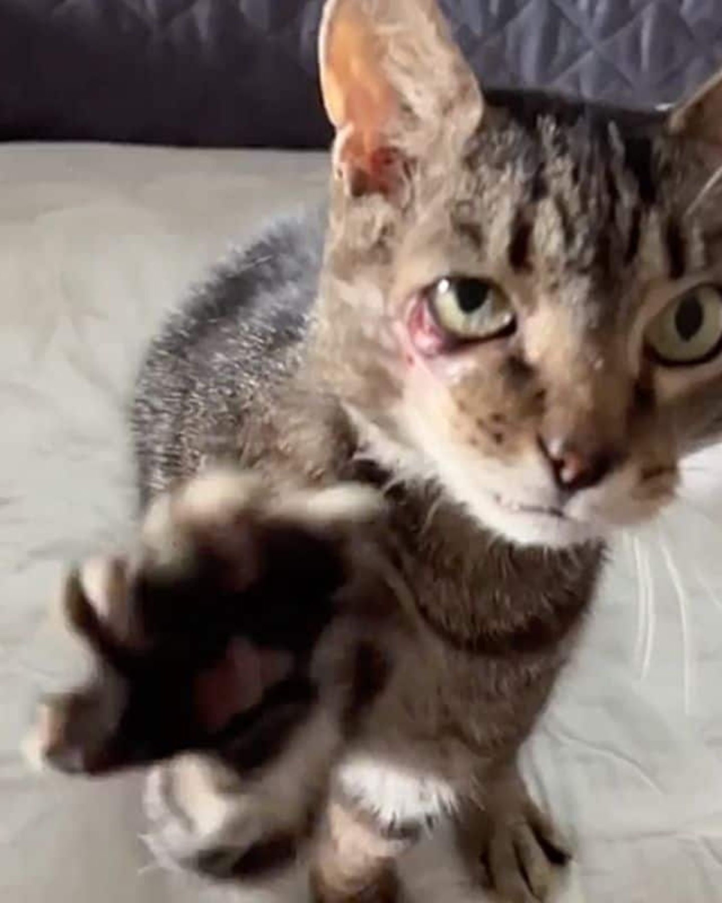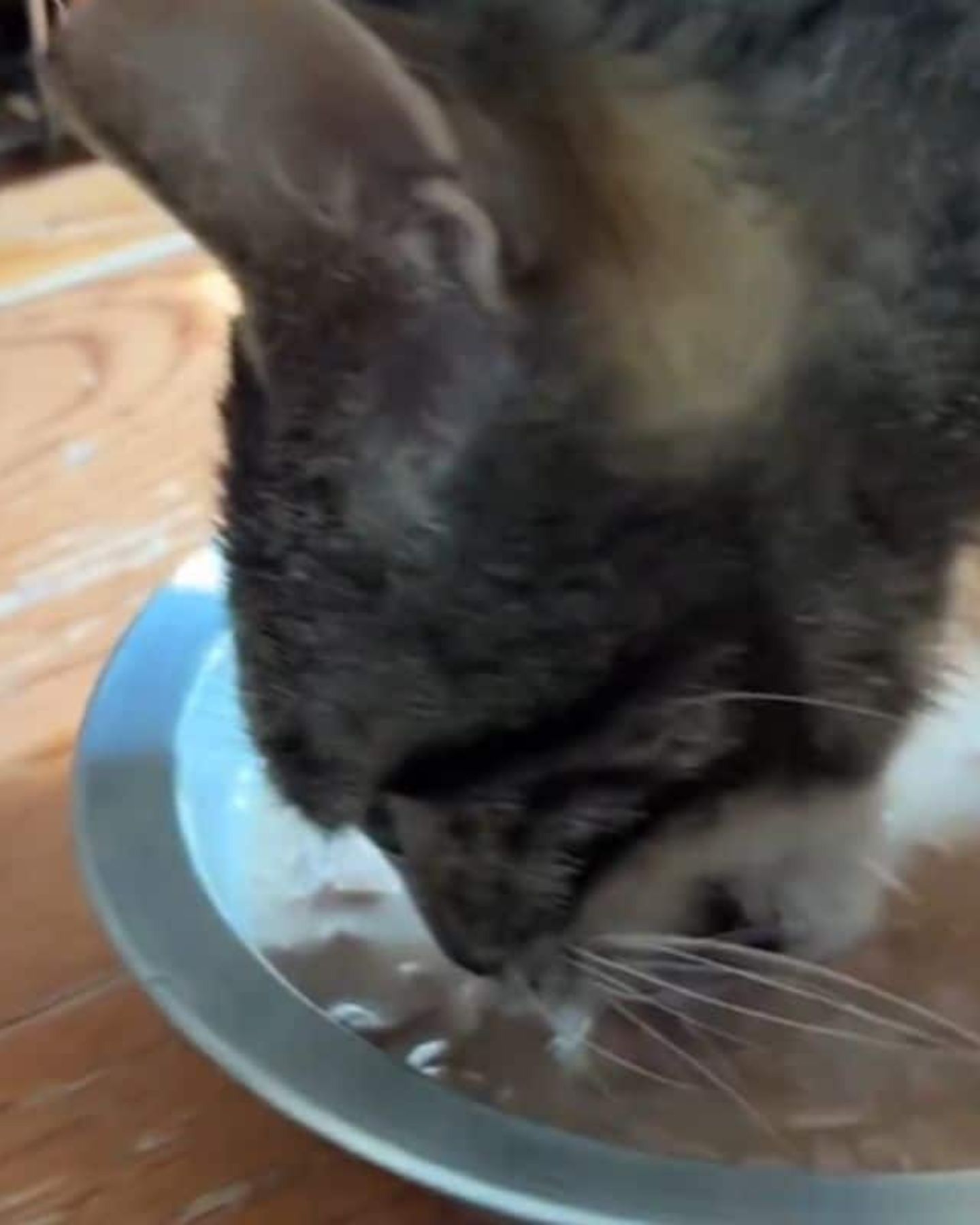 “Jules was also dehydrated and underweight. He’s catching up on lots of missed meals now, and won’t let a facial injury slow down his enjoyment of meat tube treats! Jules will never have to worry about food again, but it will take some time before he understands that—food insecurity is a common challenge for former street cats.”