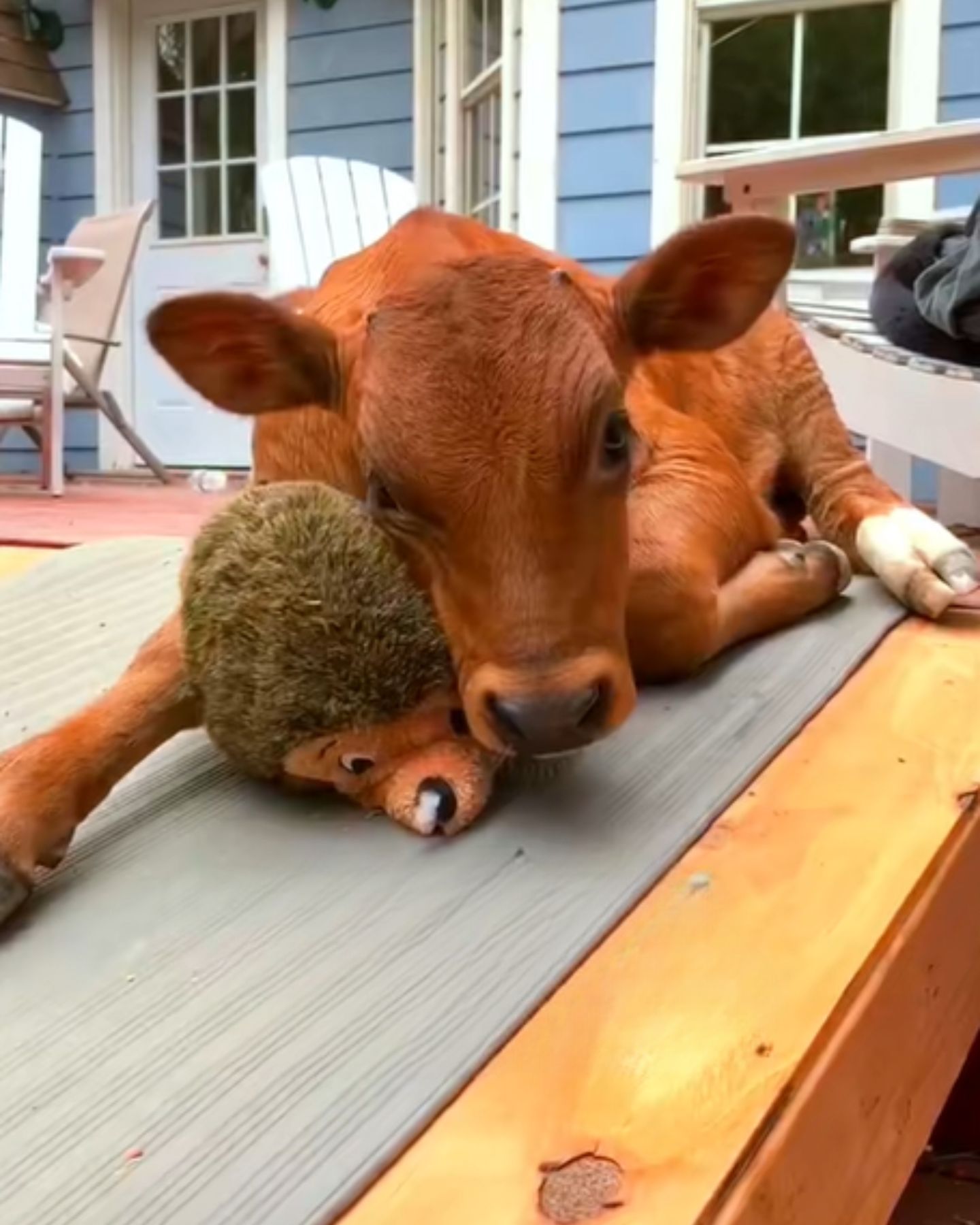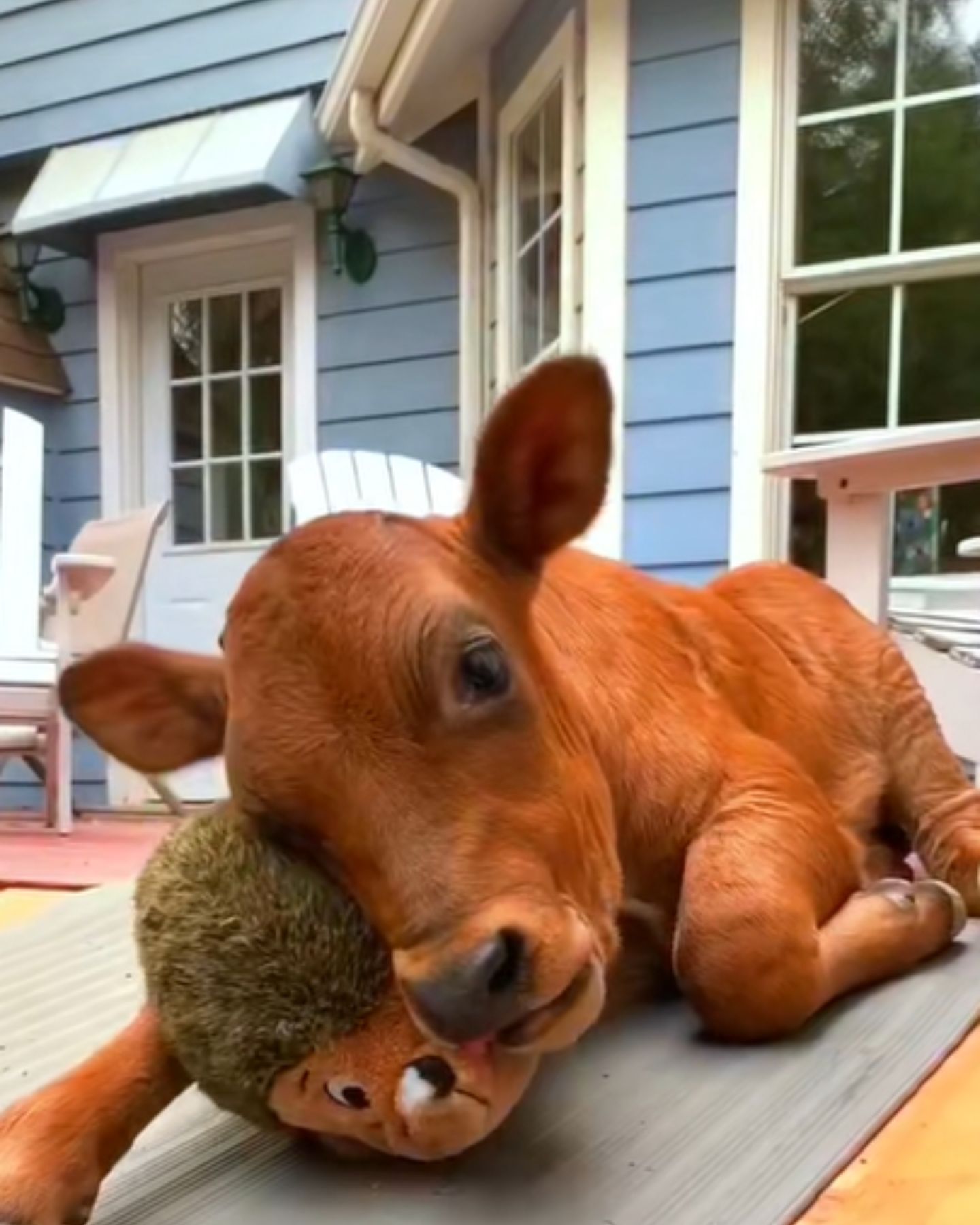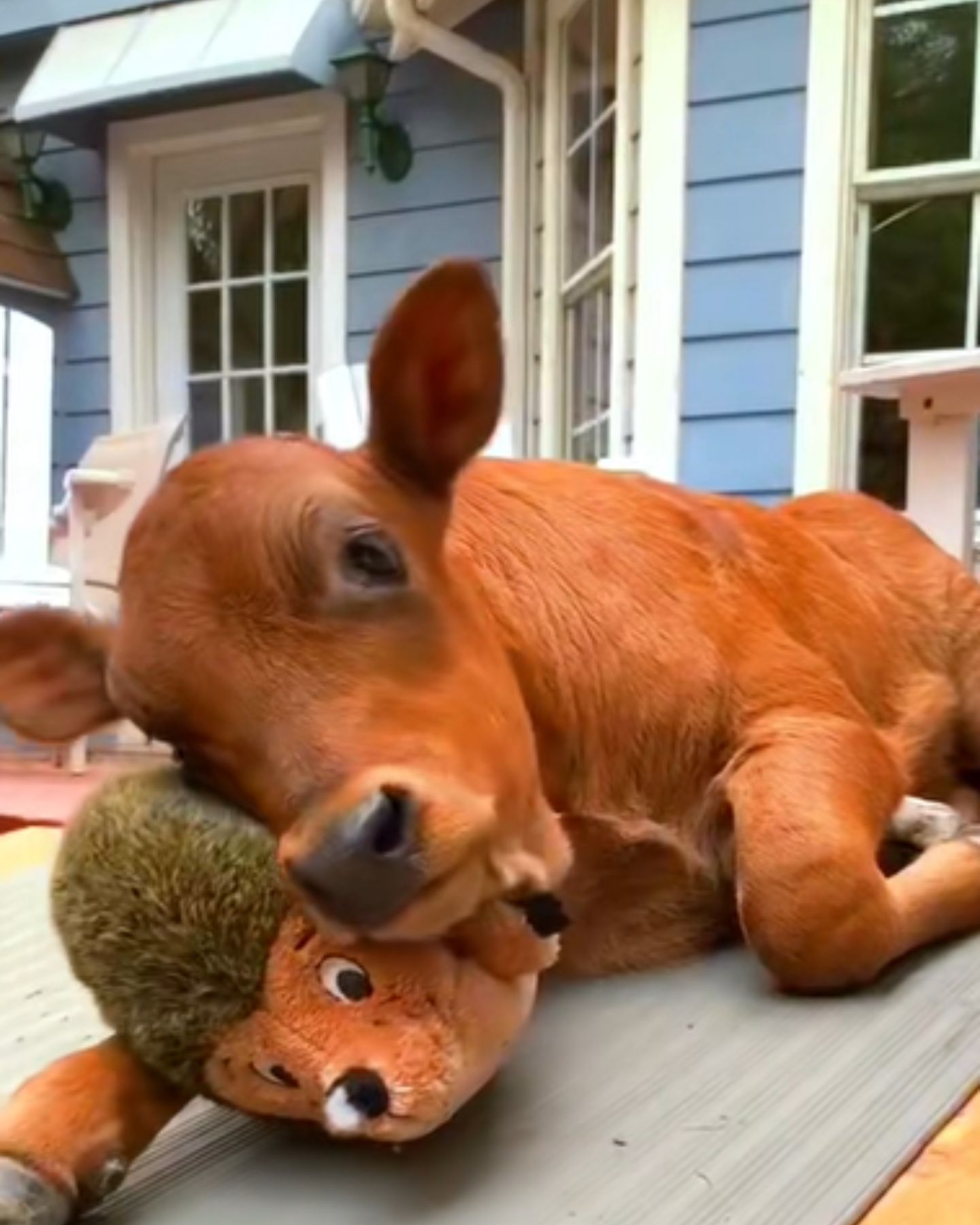 It shows that joy and comfort are universal, whether you’re a child holding a teddy bear, a dog carrying around a favorite squeaky toy, or a calf snuggling a stuffed animal.