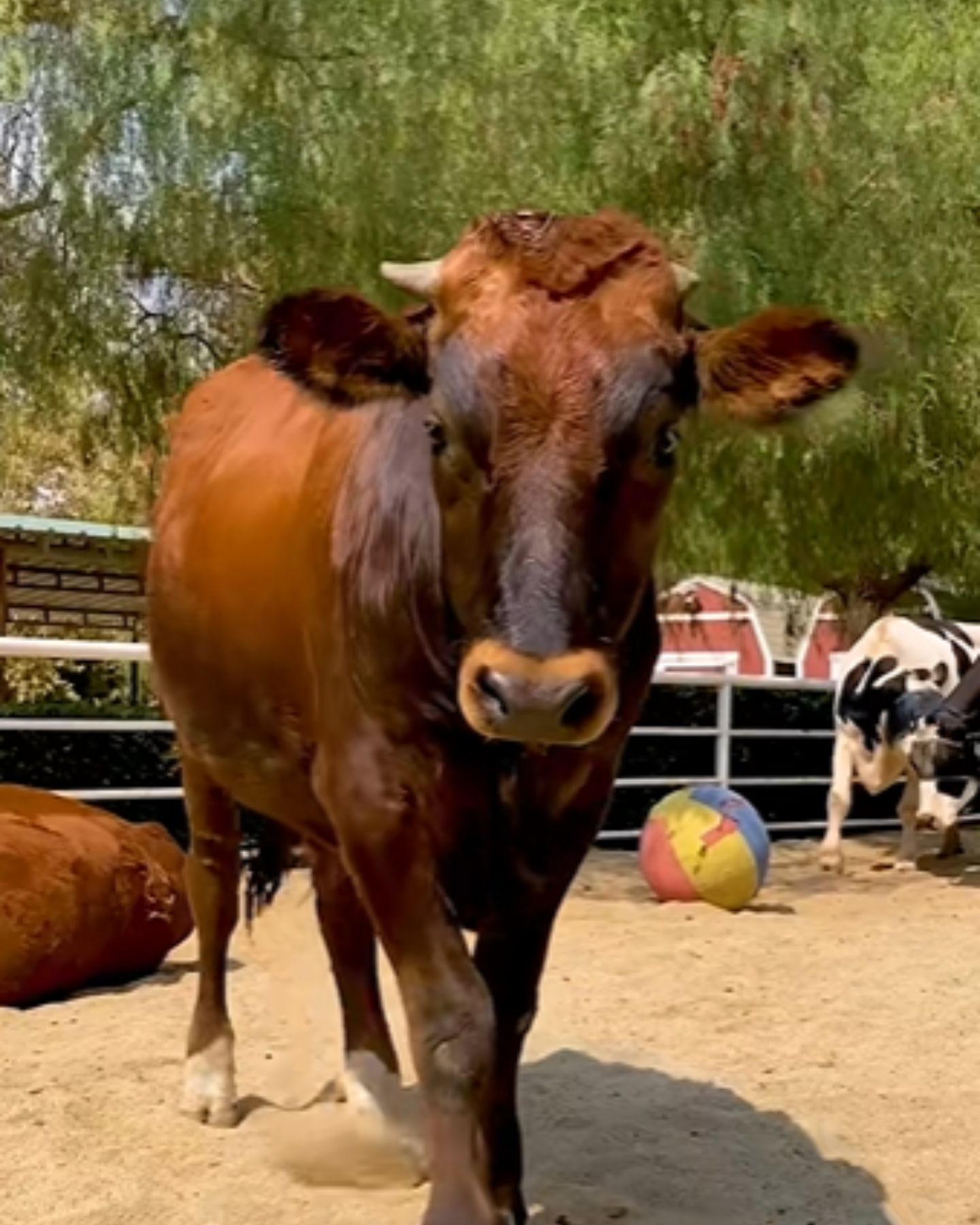 Faith, another resident at the sanctuary, illustrates this beautifully. Faith is a blind cow, yet she’s found her greatest joy in a large bouncy ball. To her, the ball isn’t just a toy, it’s her constant companion.