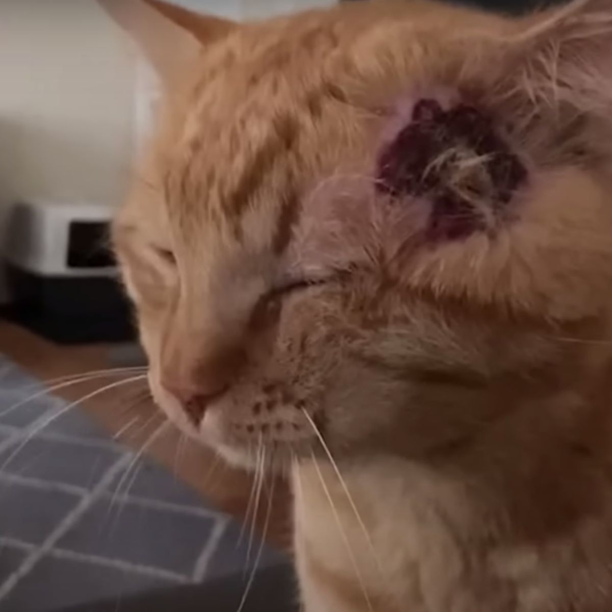A feral cat began showing up outside the house, and before long, the two males started fighting. One encounter left Peach with a painful bite on his ear.