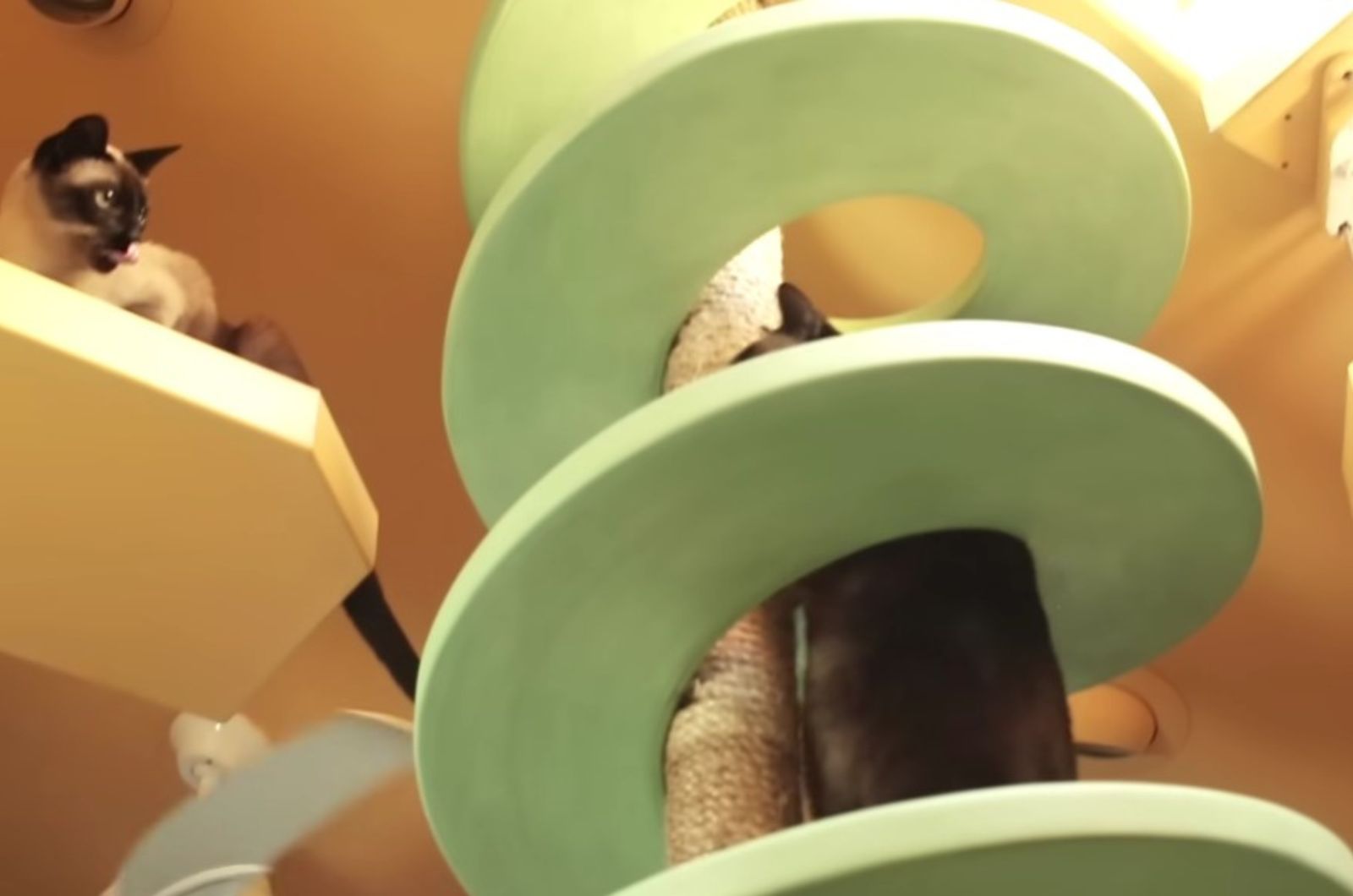 Every room in Peter’s house flows into the next, creating endless opportunities for exploration and play. Bridges, spirals, tunnels, scratching posts, you name it, Peter has built it all.