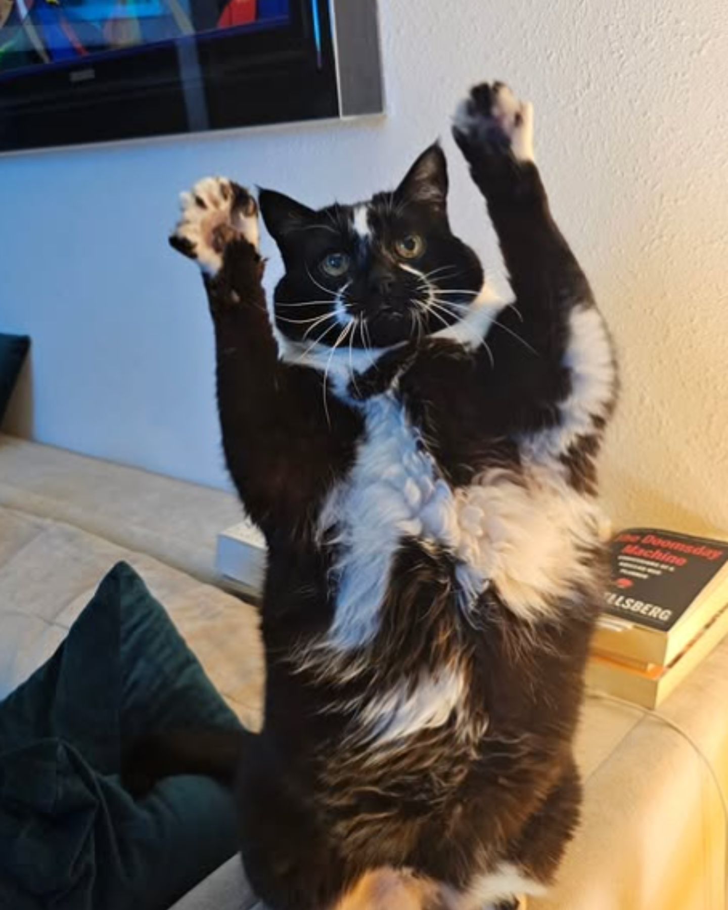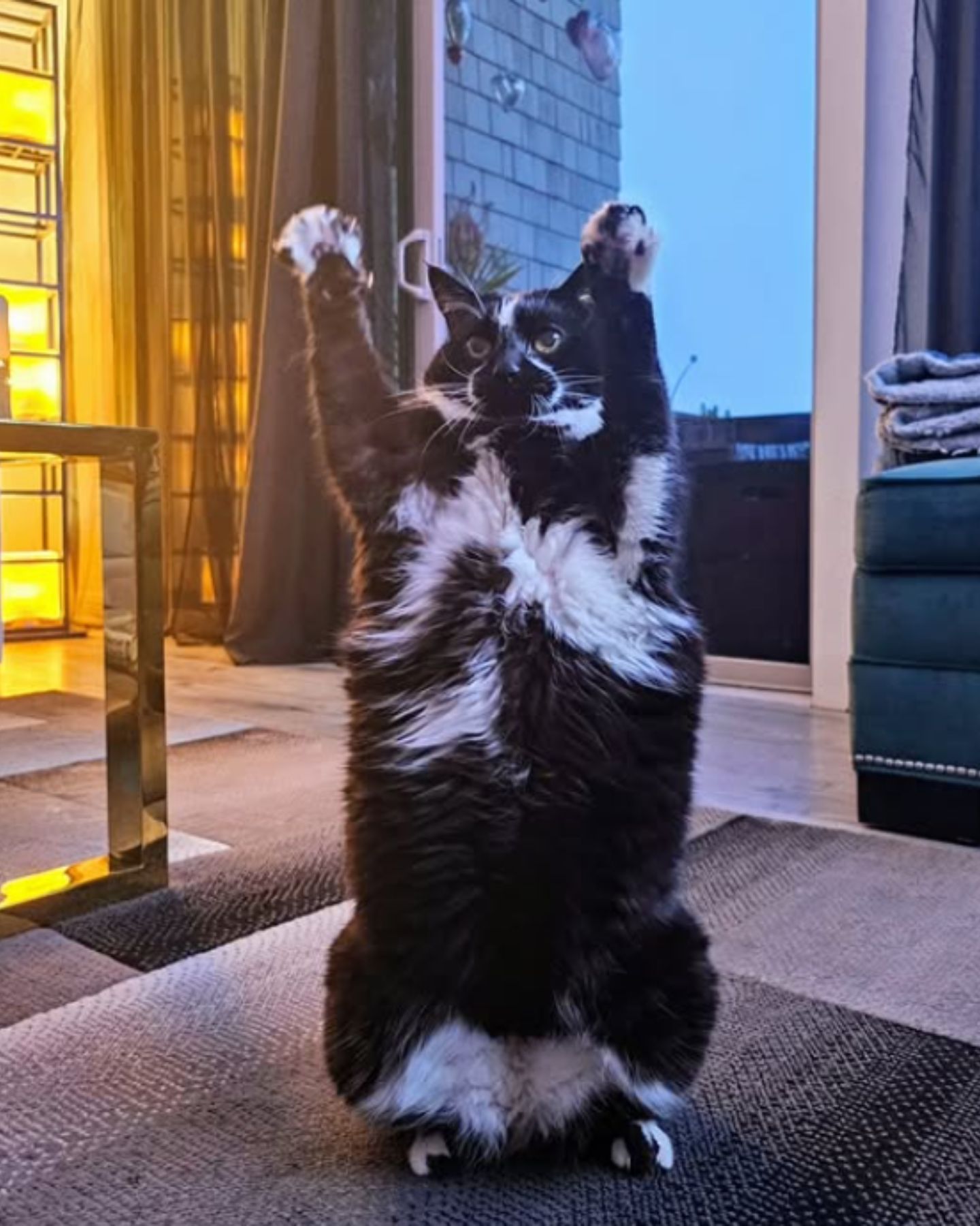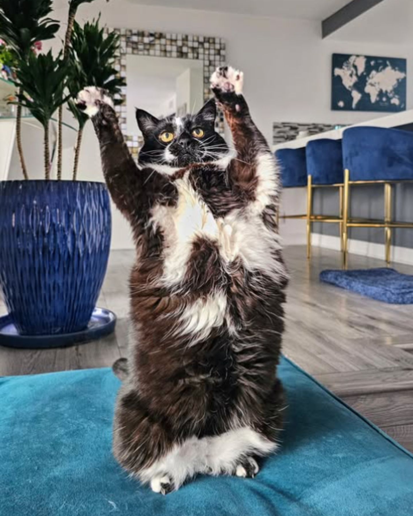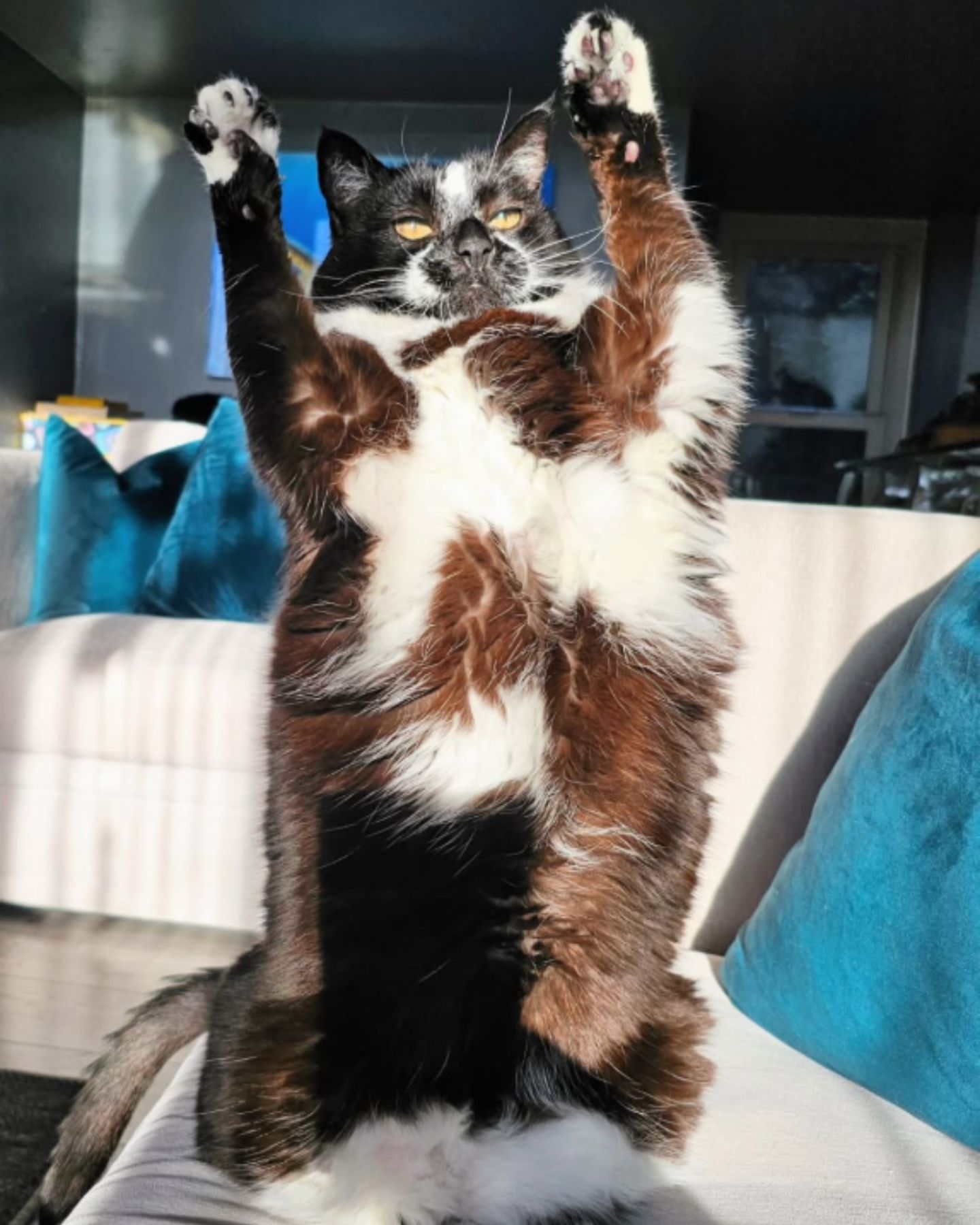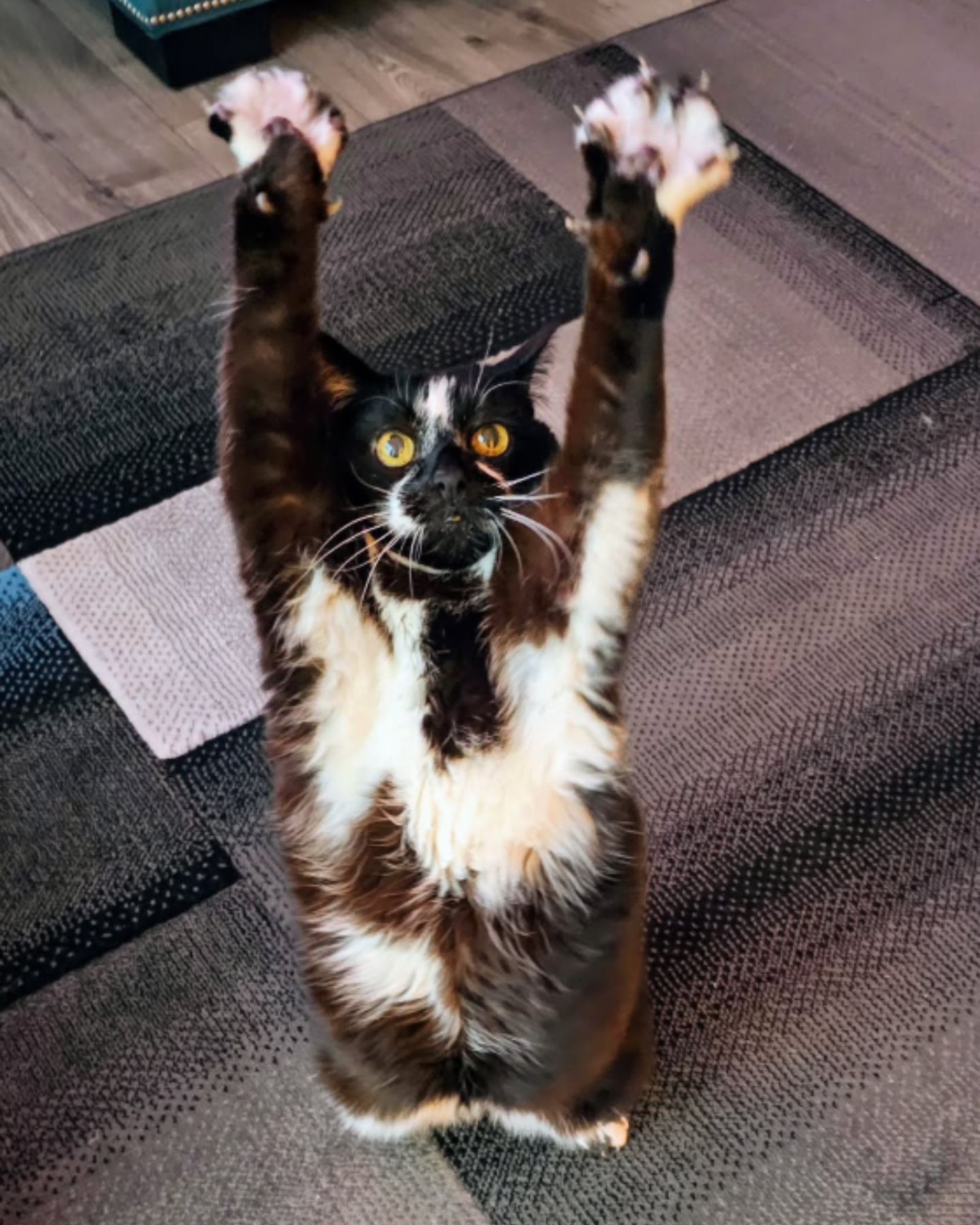 Without warning, she shot her paws straight up into the air, almost like a person stretching after a long nap – or maybe even like a referee signaling a touchdown.