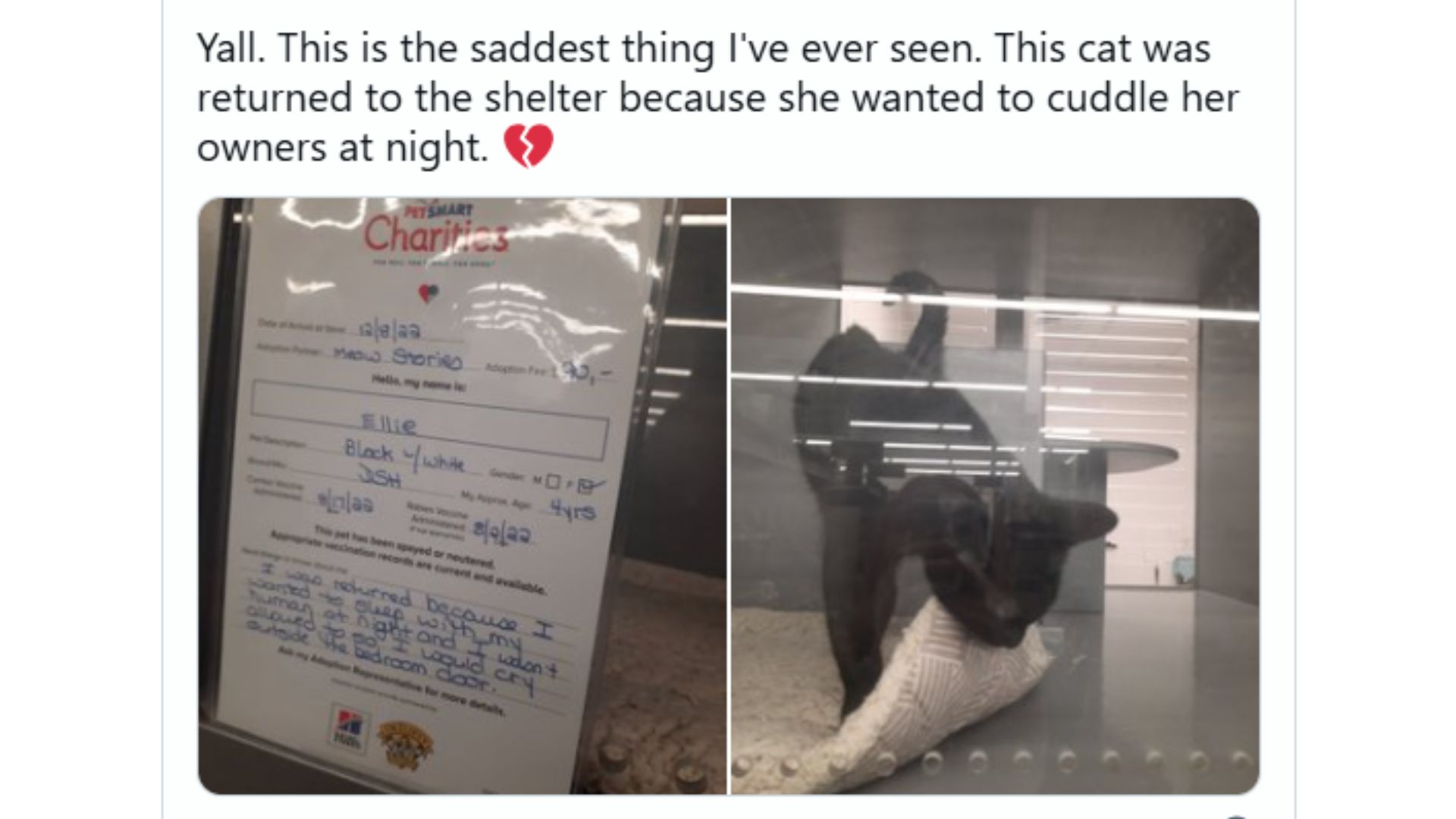 Julia learned from the note that the cat’s name was Ellie and that she was about 4 years old. However, below her general information, Julia discovered the heartbreaking reason why Ellie was returned to the shelter.