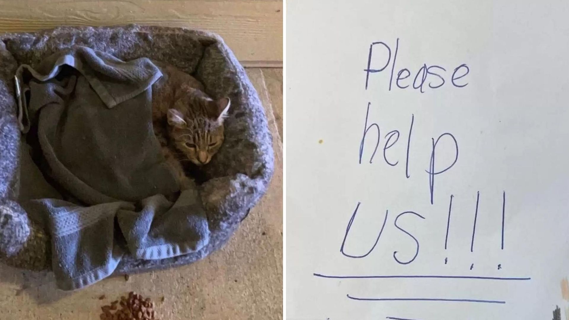 When she arrived, her eyes were drawn to something taped above the mailboxes, right near where the cat was resting. A simple handwritten note caught her attention. It read: “Please help us.”