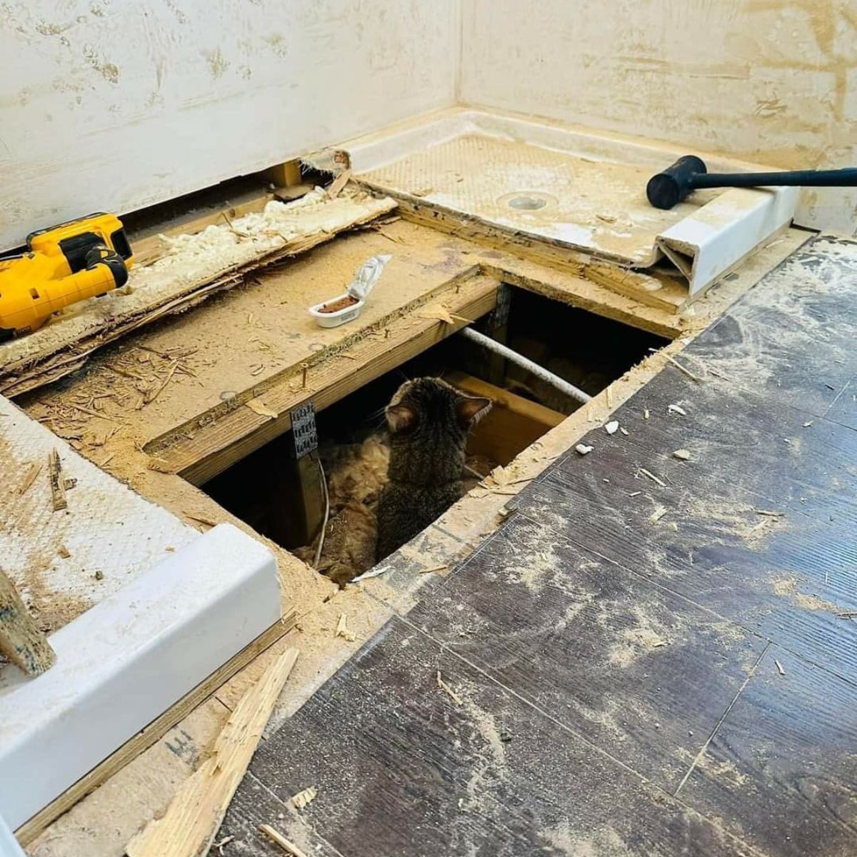 Photos shared by the crew showed the extent of the work required to free the trapped kitty: torn-up floorboards and a hole where the shower once stood, revealing the careful effort taken to rescue the little cat.