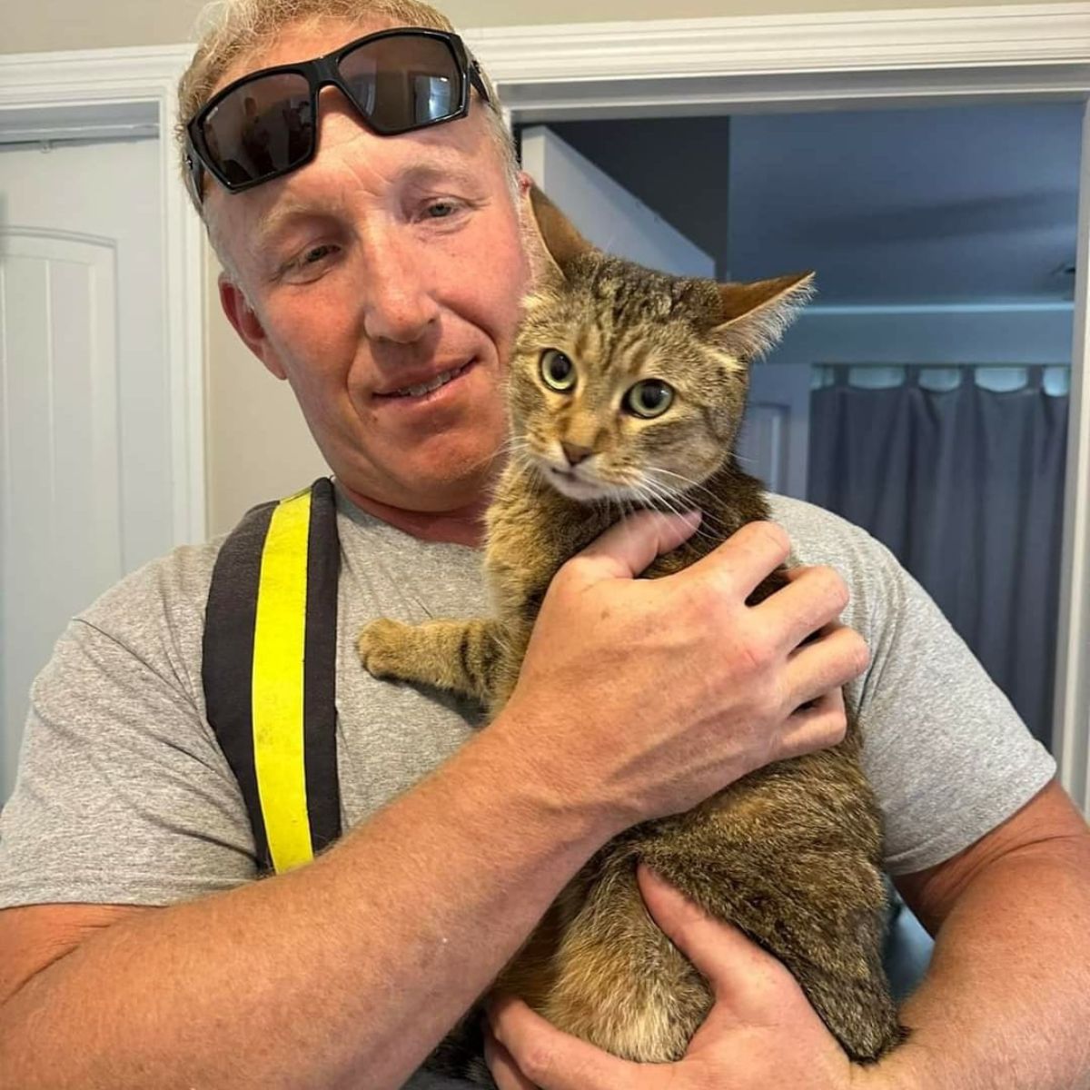 One firefighter even formed a quick bond with the rescued cat, captured in a touching photo of the man cradling the feline in his arms.