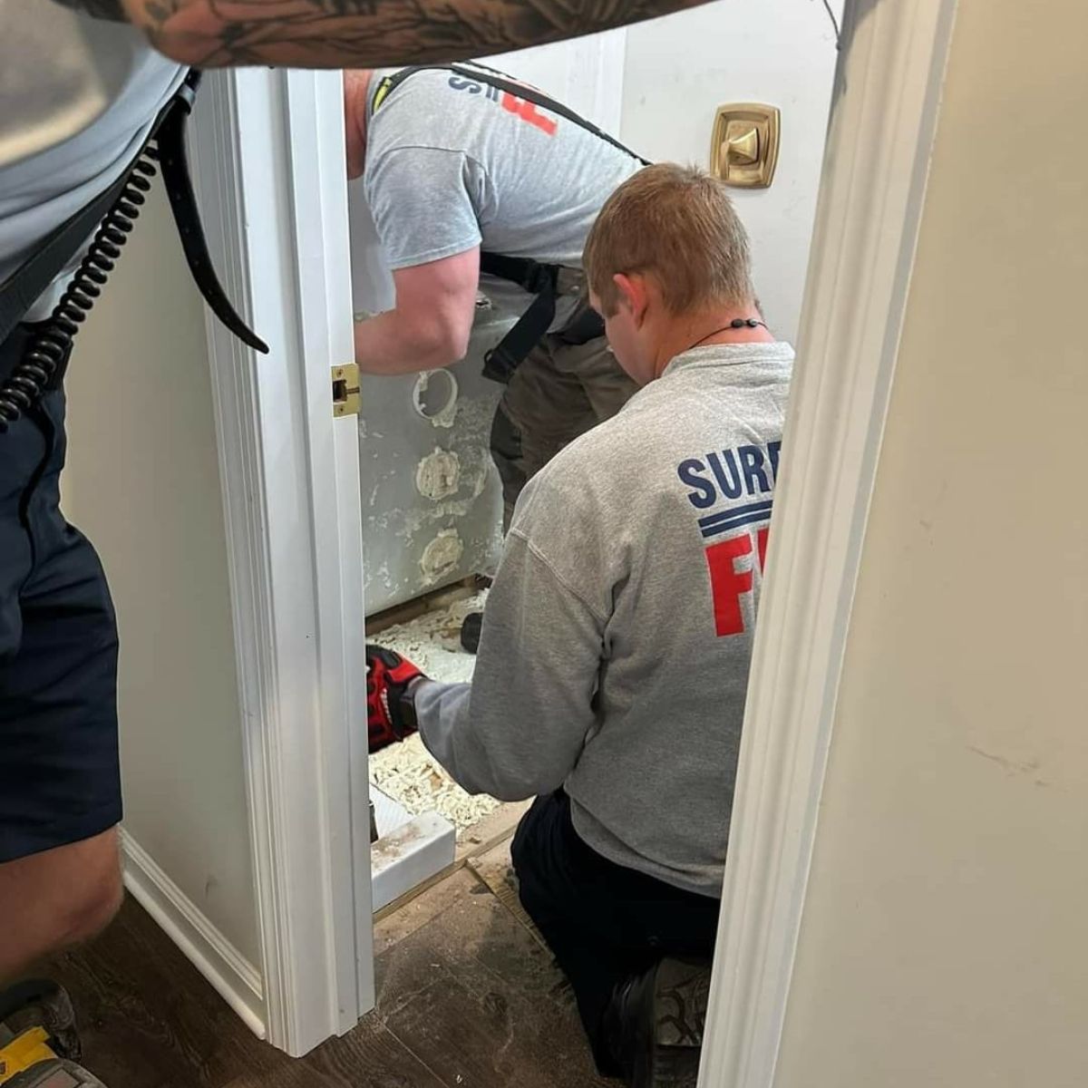 “We never know what kind of calls we will be paged out to. Sometimes our furry friends need our help. Yesterday 23-b shift responded to a cat sealed under the floorboards after a shower remodel.”