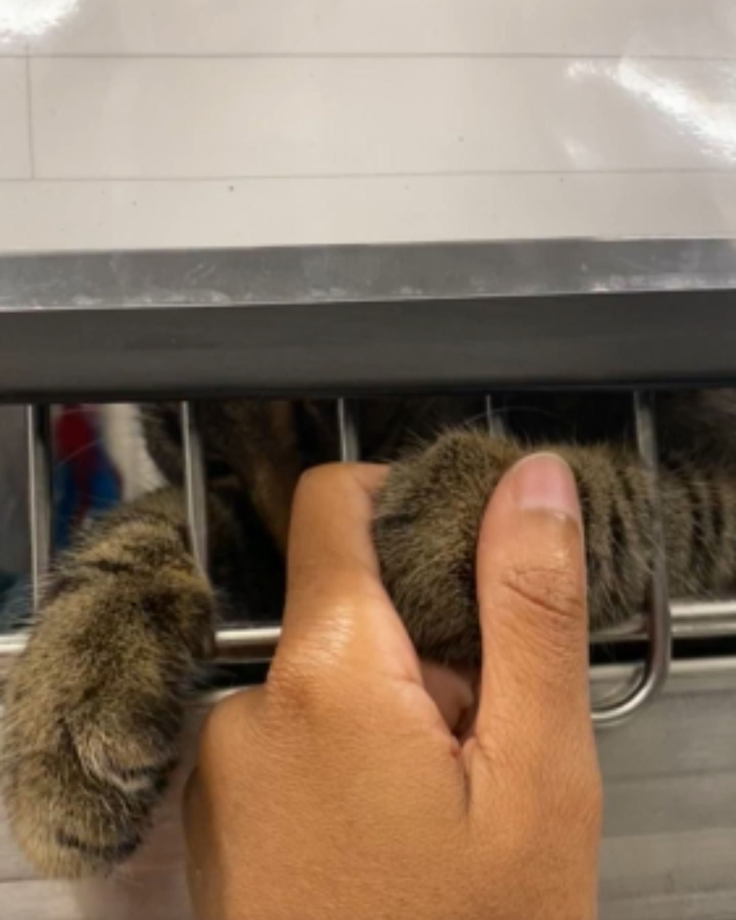 It’s heartbreaking, but also incredibly moving. Here is a cat who refuses to be overlooked, who insists on being noticed, not with meows or cries, but with the simplest of gestures – holding your hand like he never wants to let go.