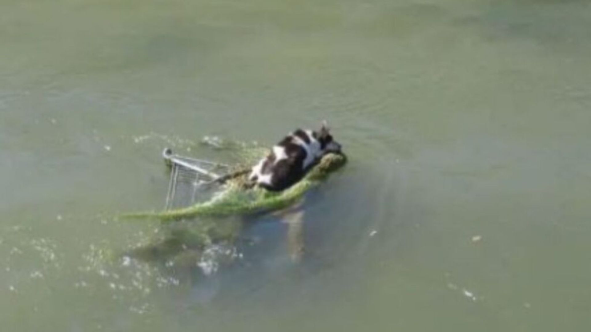 A shopping cart was stuck in the fast-moving water. But on top of it… something didn’t look right.