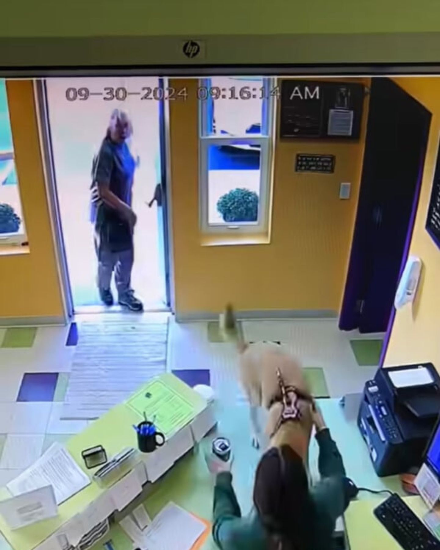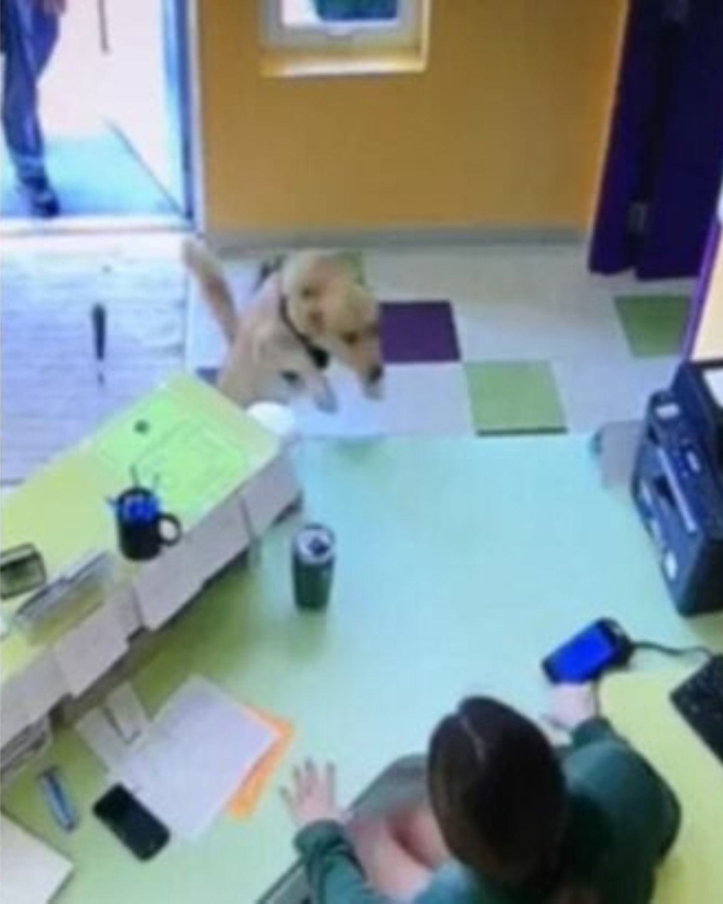 Then, in one swift move, she launched herself right over the front counter and landed in front of her favorite daycare worker.