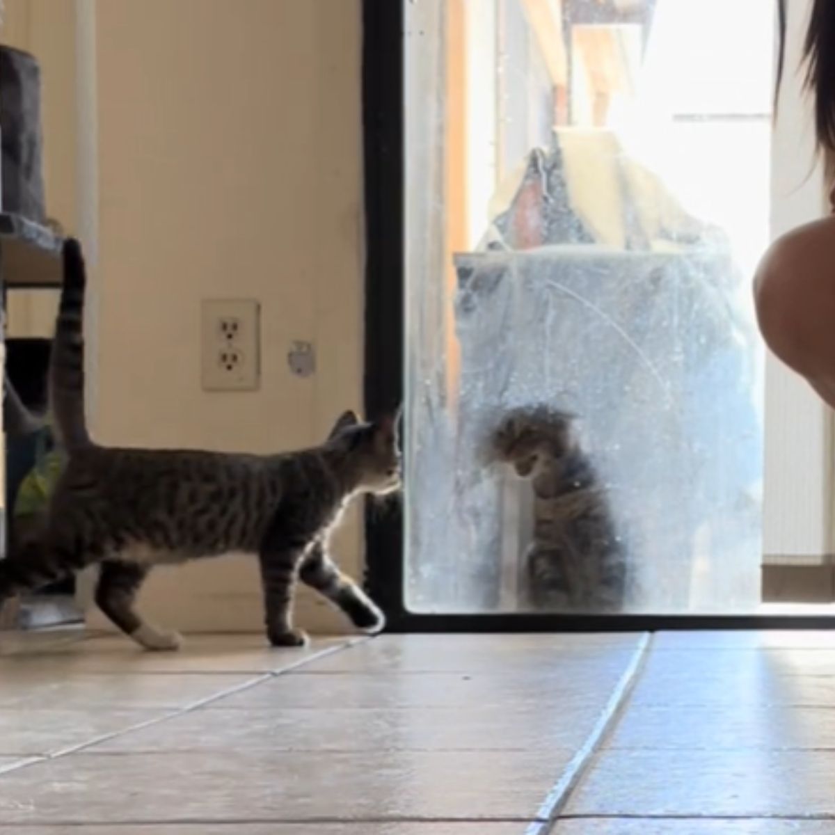 To avoid conflict, Yasmin kept the cats in separate rooms. But after three days, progress began. Through glass doors, Aiko gradually stopped hissing at Silo and started observing him calmly.