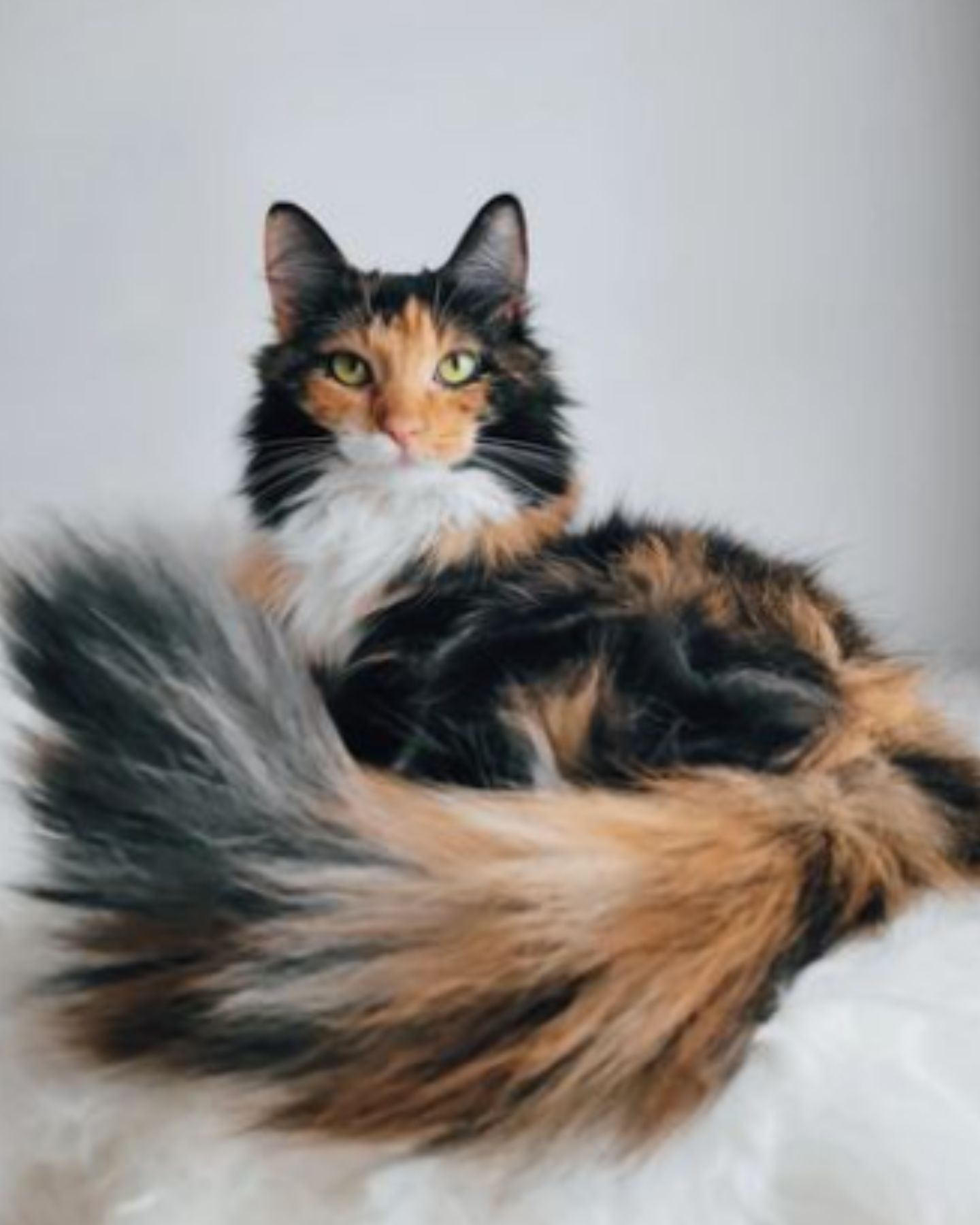 A beautiful, long-haired calico kitten was wandering all alone in a freezing Michigan winter, at only eight weeks old.