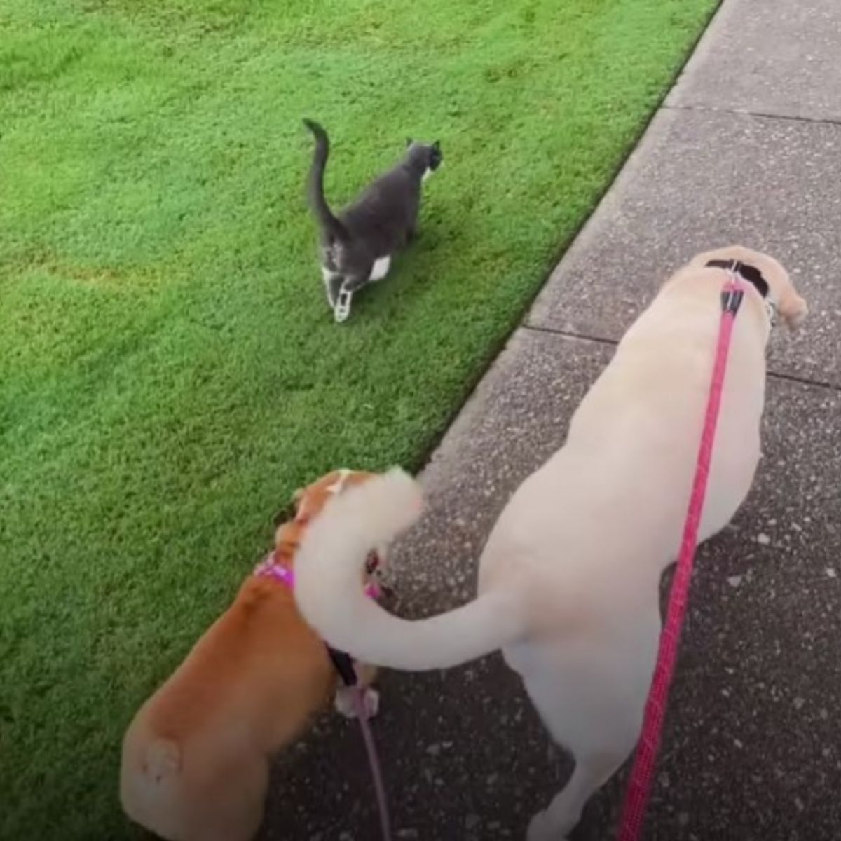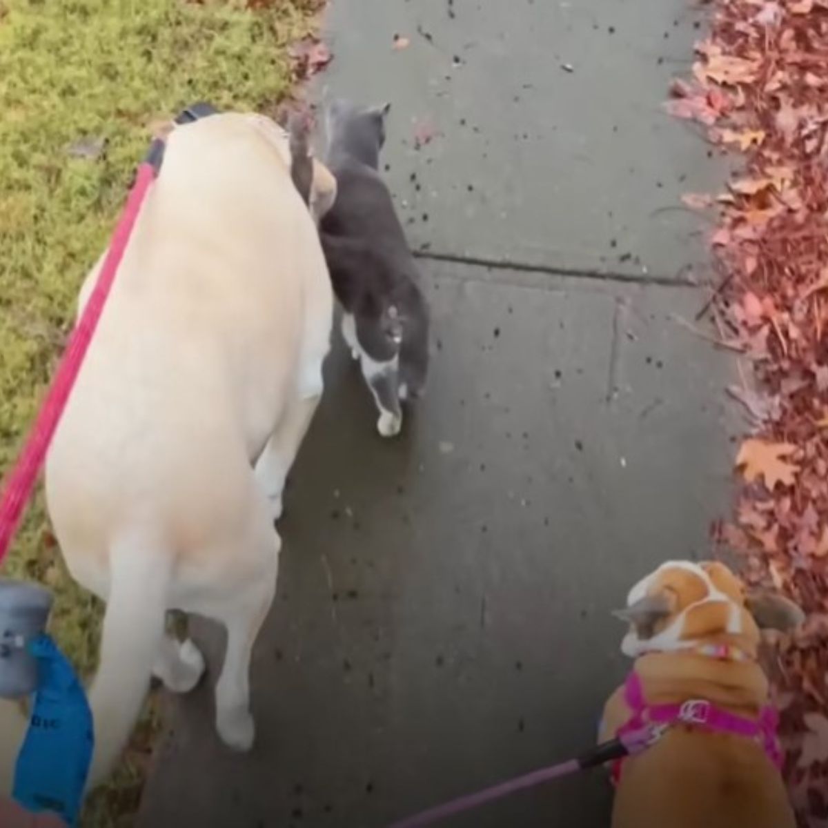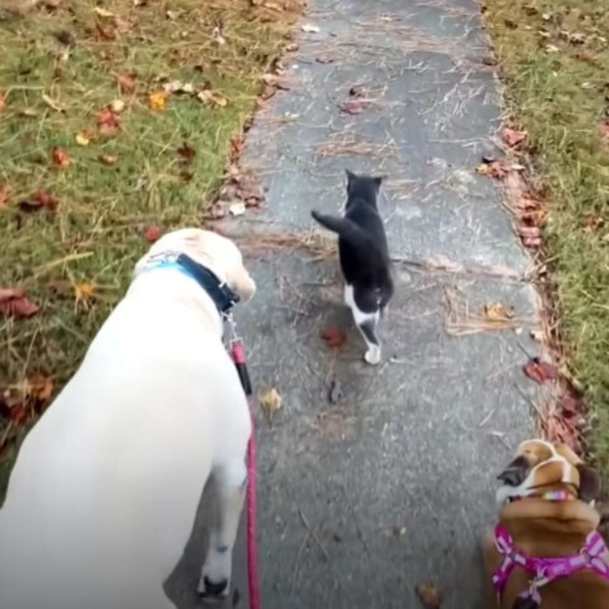 He showed no fear of the two dogs that lived inside and seemed determined to make himself part of their routine. Before long, he began joining the family on their daily walks through the neighborhood.