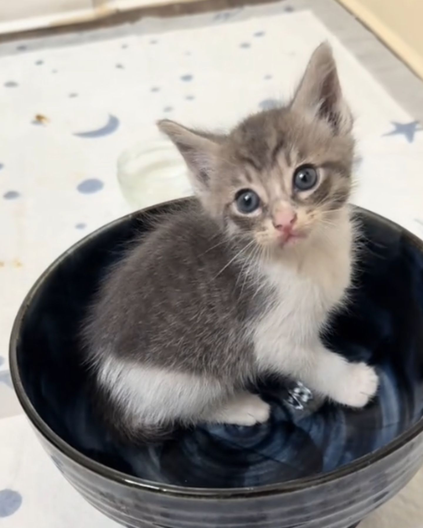 She scooped up the kitten, tucked her against her chest, and hurried home. Inside, she cleaned the crust from around the kitten’s little eyes and set out some food.