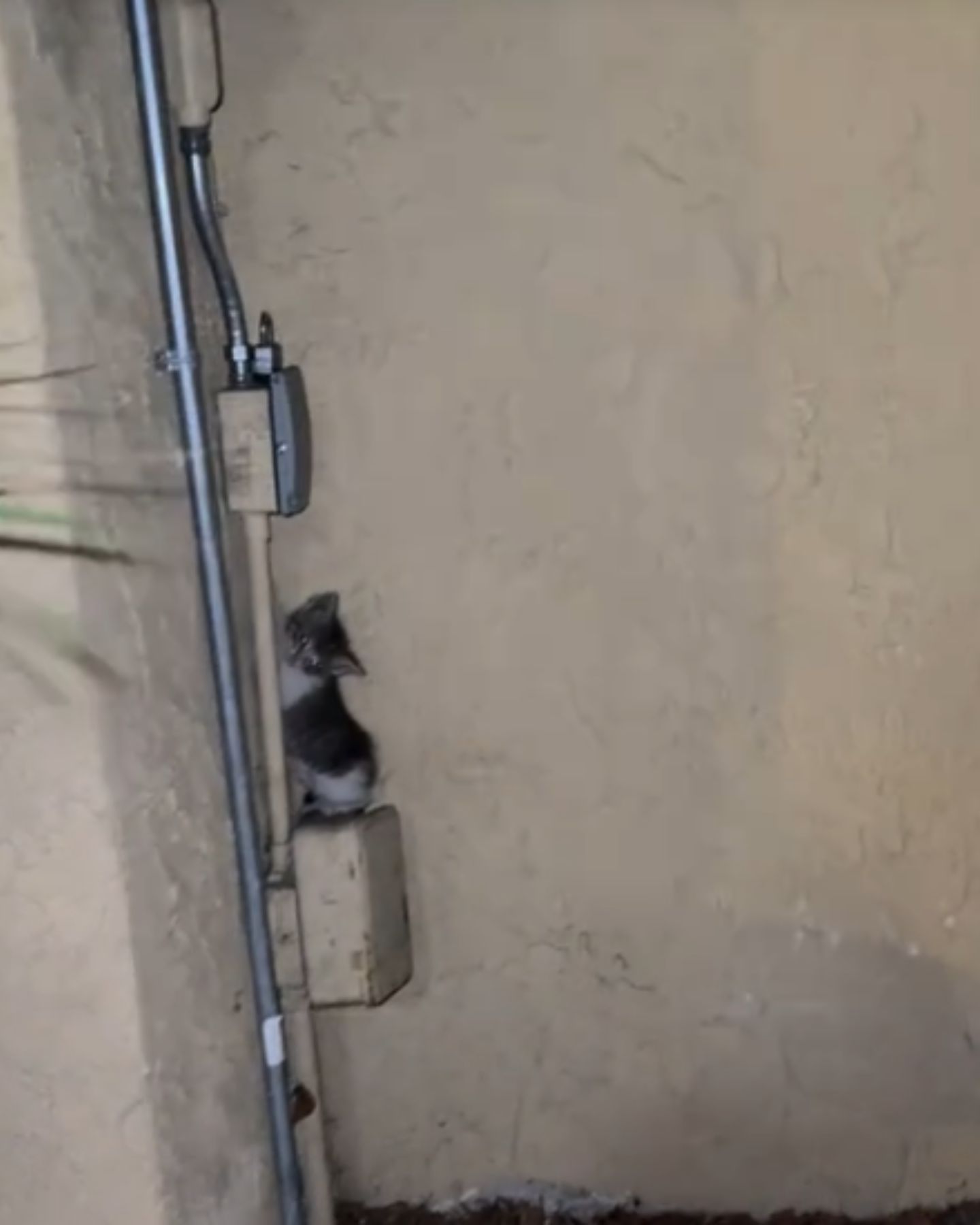 Following the sound, Siena finally spotted her: a tiny kitten huddled on top of an electrical box, soaked from the rain and trembling from the cold.