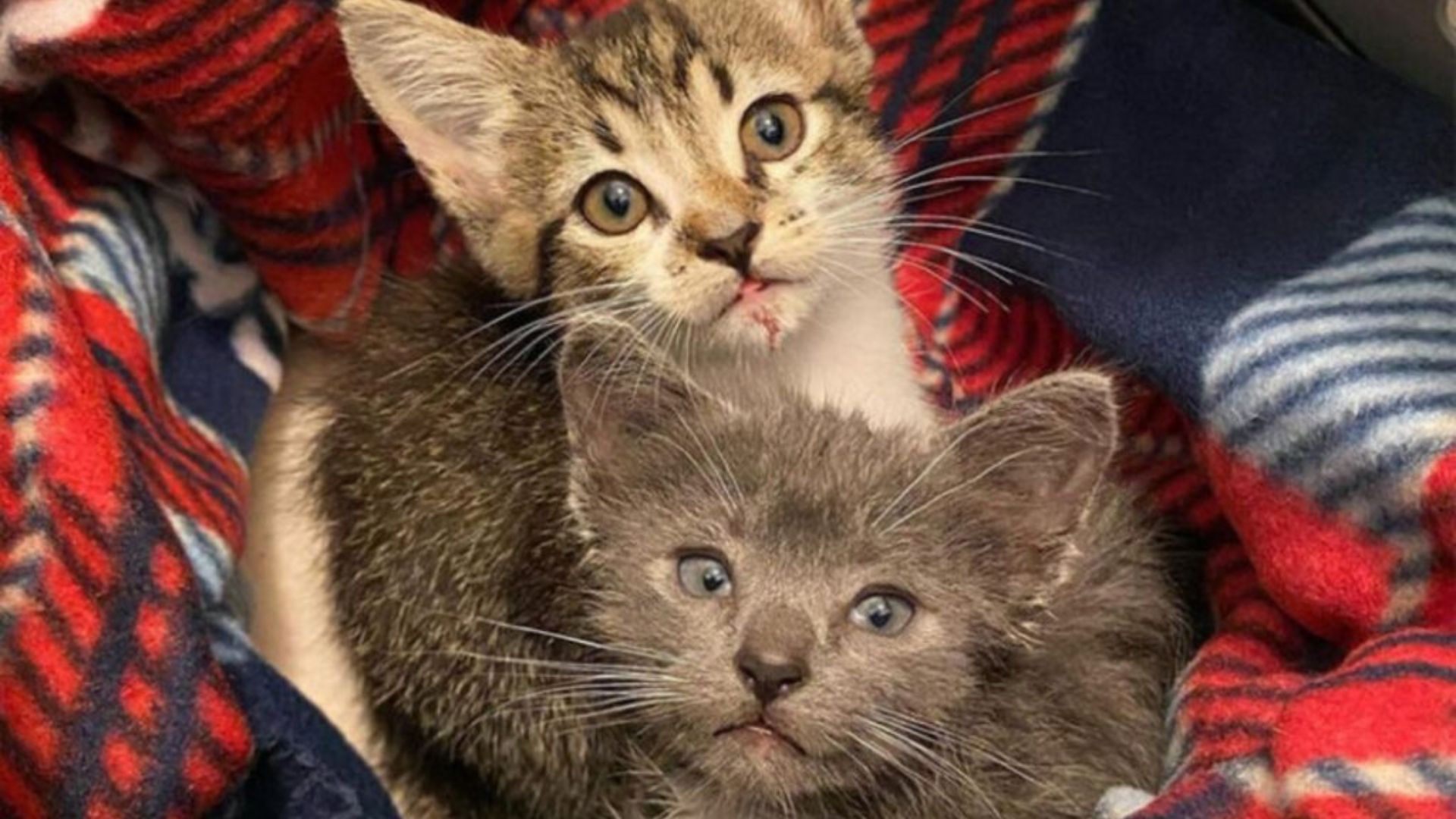 When he crouched down to look closer, he discovered a pair of terrified kittens, a gray male and his tabby sister, huddled together and crying for help.