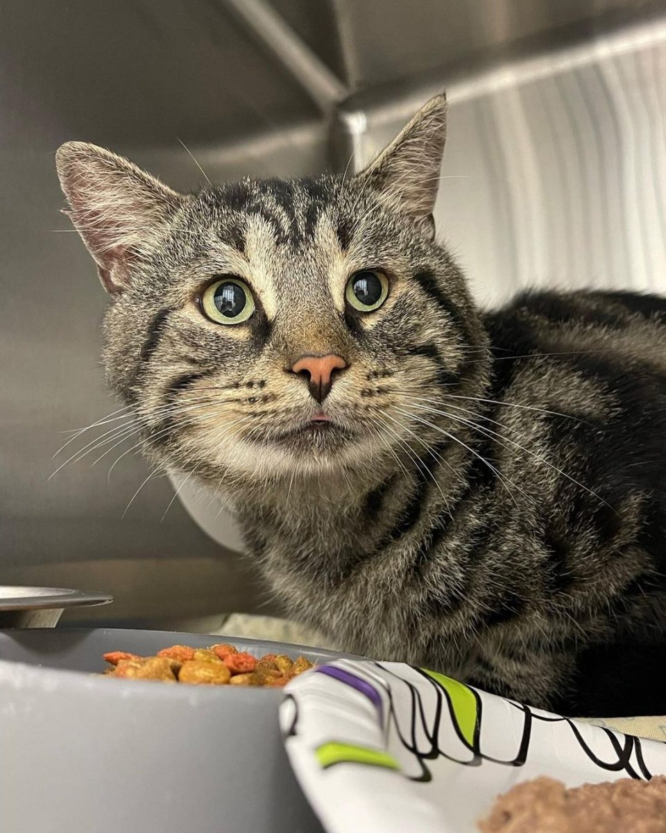 “Fishtopher is very sad and depressed and will only eat when he has company. Fishtopher reminds you of a Bengal with his coloring, he is a sweet, easy-going, laid-back boy. Fishtopher loves being petted and is an affectionate boy. He is a big cheeky boy, wouldn’t you love rubbing on those big cheeks?”