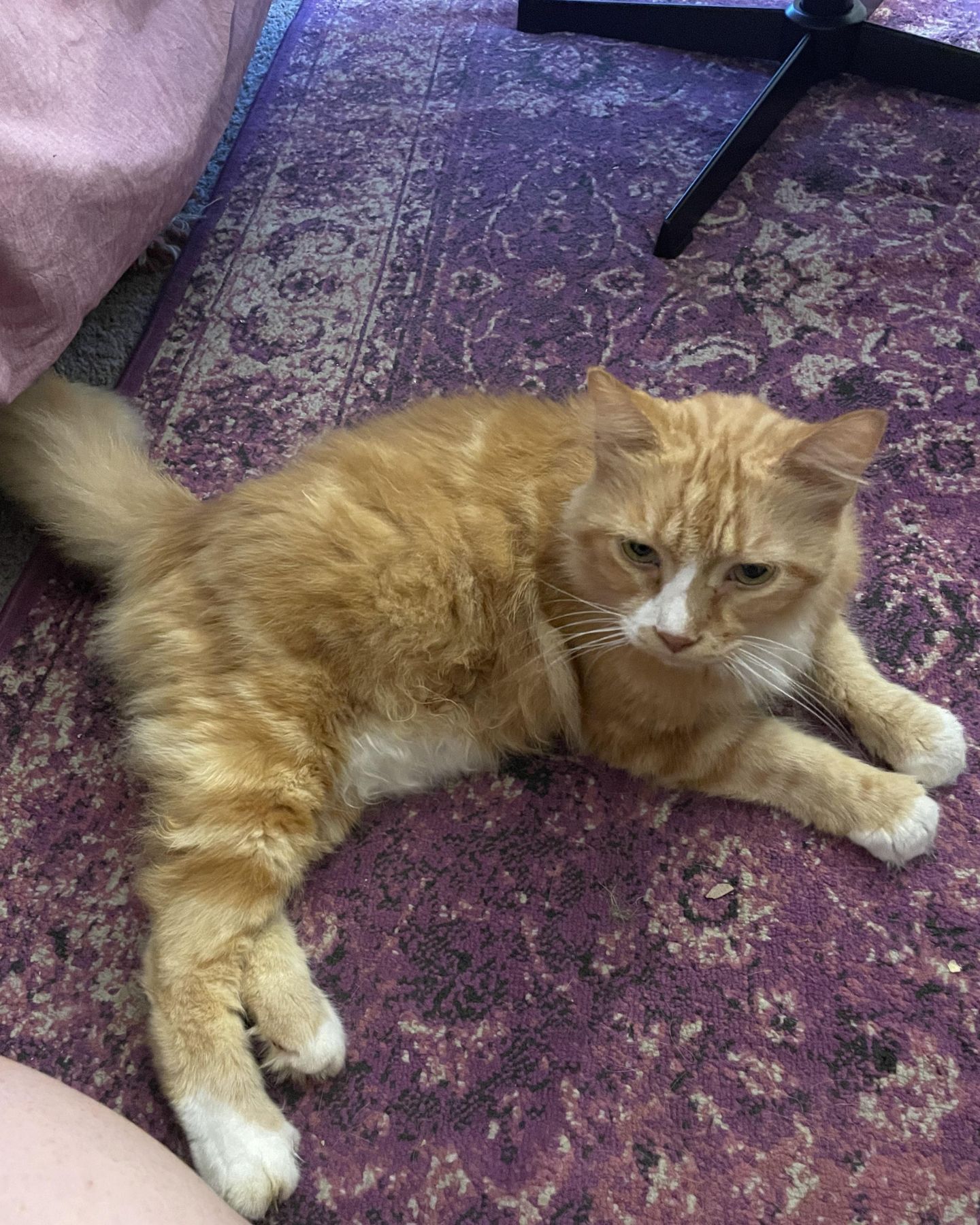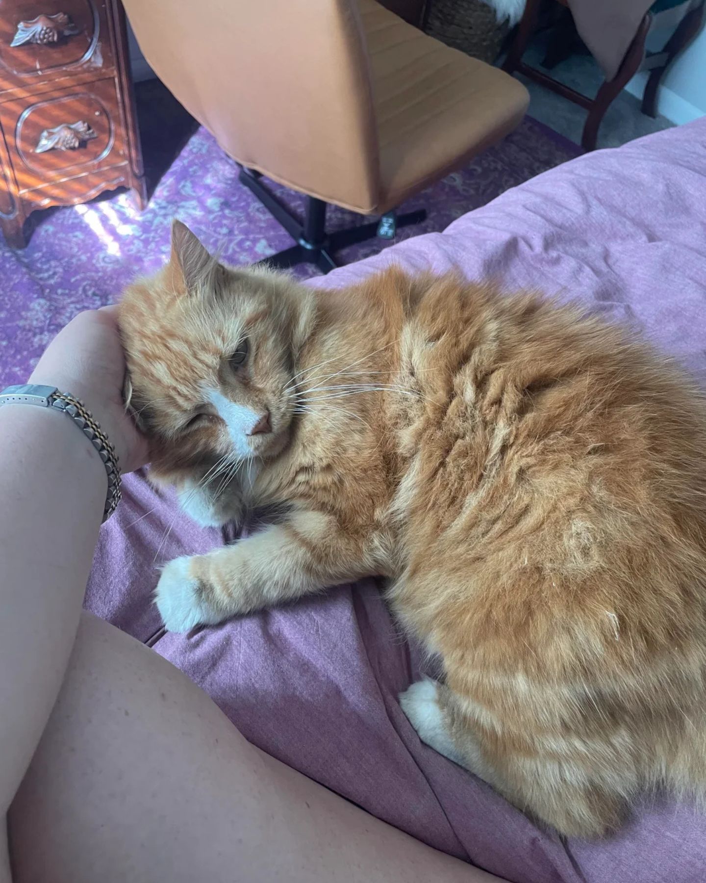 “He has a vet visit this week before we start introducing our other cat to him, so right now he’s staying in my guest room, chilling… He’s been sleeping a lot, but when he’s awake, he’s so charming and funny.”