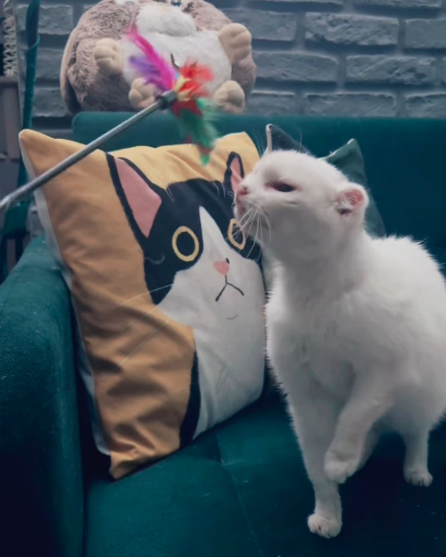 Then, something incredible happened. After months of showing no interest in toys, Chmurka started playing. One day, she batted at a toy with her paws, marking a major milestone in her journey.