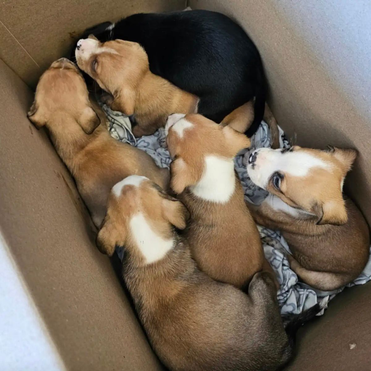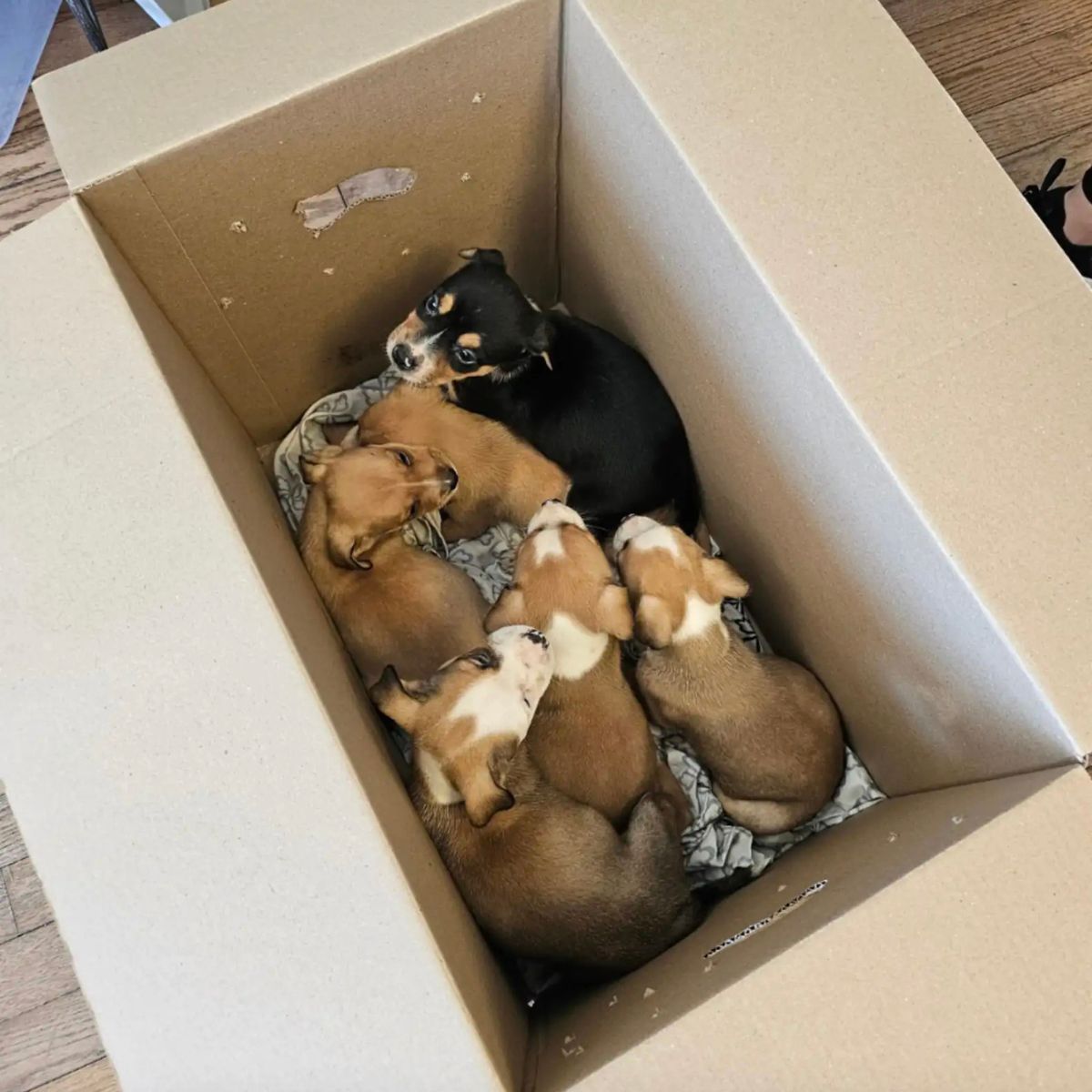 Before long, the rest of the team arrived, and together they carried the box inside. As they peeled back the tape and lifted the flaps, six little faces blinked up at them.