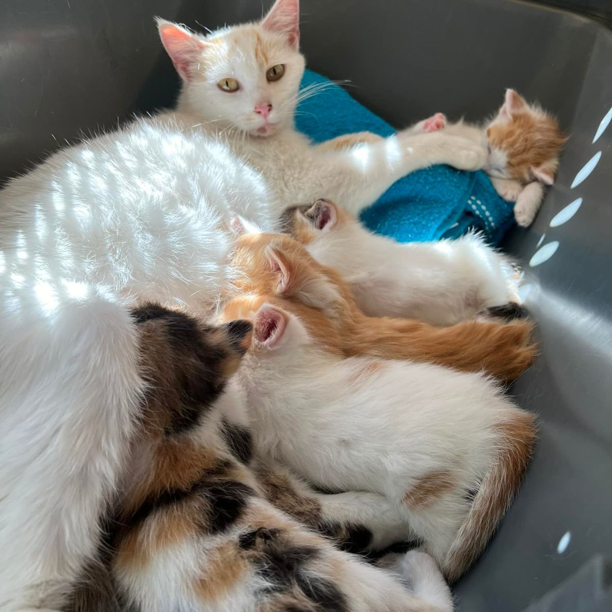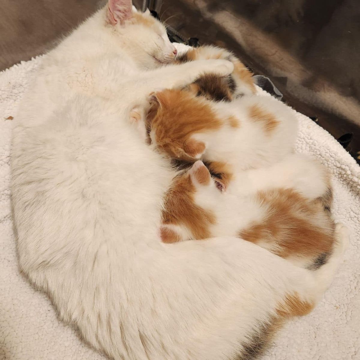 It quickly became clear that this wasn’t one litter but two. Christina pieced it together: the older cat was actually the mother of the younger cat.