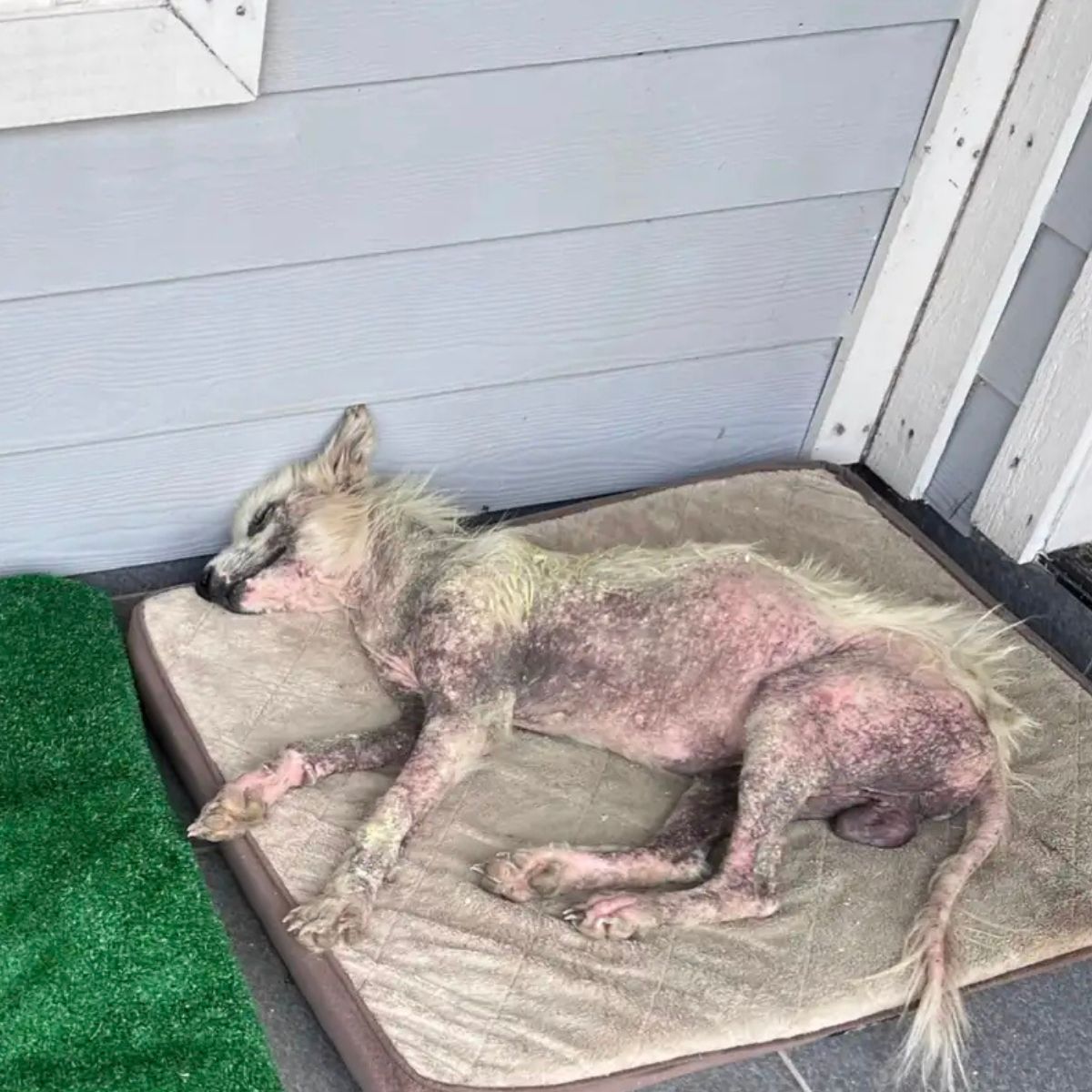 Curled up on the cold floor was a dog in heartbreaking condition. His skin was bare and inflamed, his ribs sharp beneath his fragile frame. Mange had ravaged his body, leaving behind painful sores and patches of raw skin.