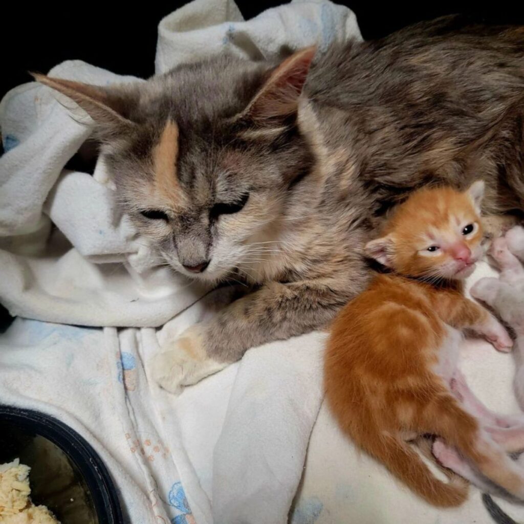 Janet couldn’t bear the thought of leaving the mama cat behind. She immediately turned around to pick her up too. Soon, the whole little family was safe and sound.