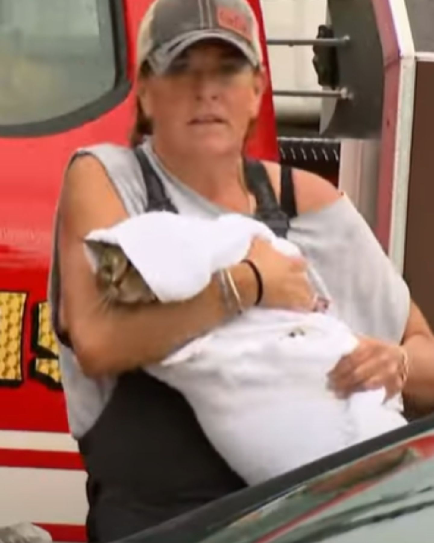 The mama cat, later named Fuzzy Bear Buckets, quickly began to calm down once she realized she and her kittens were safe. Heather, who couldn’t bear to set her down, carried Fuzzy Bear in her arms as they moved to dry ground.