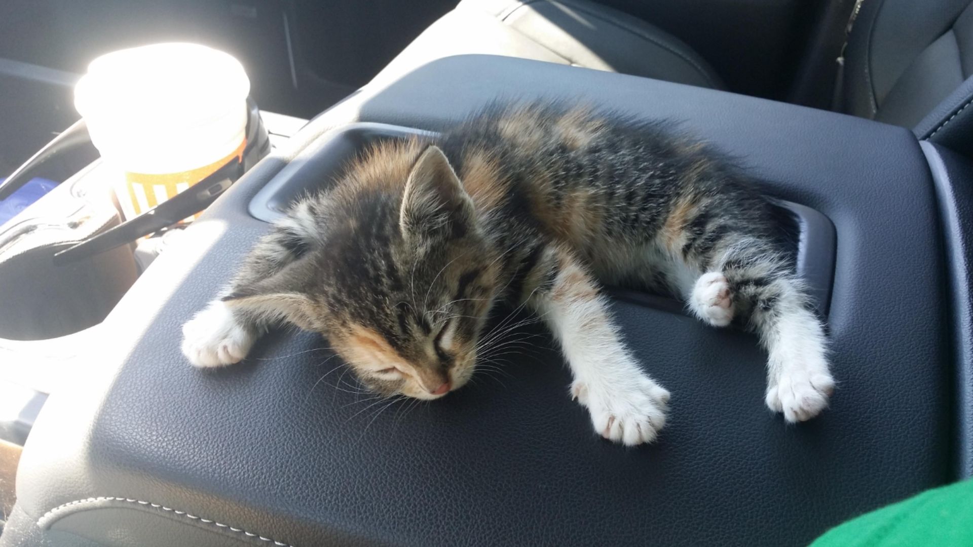 As soon as Matt sat back in the driver’s seat, the little kitten climbed right onto his shoulder, purring softly.