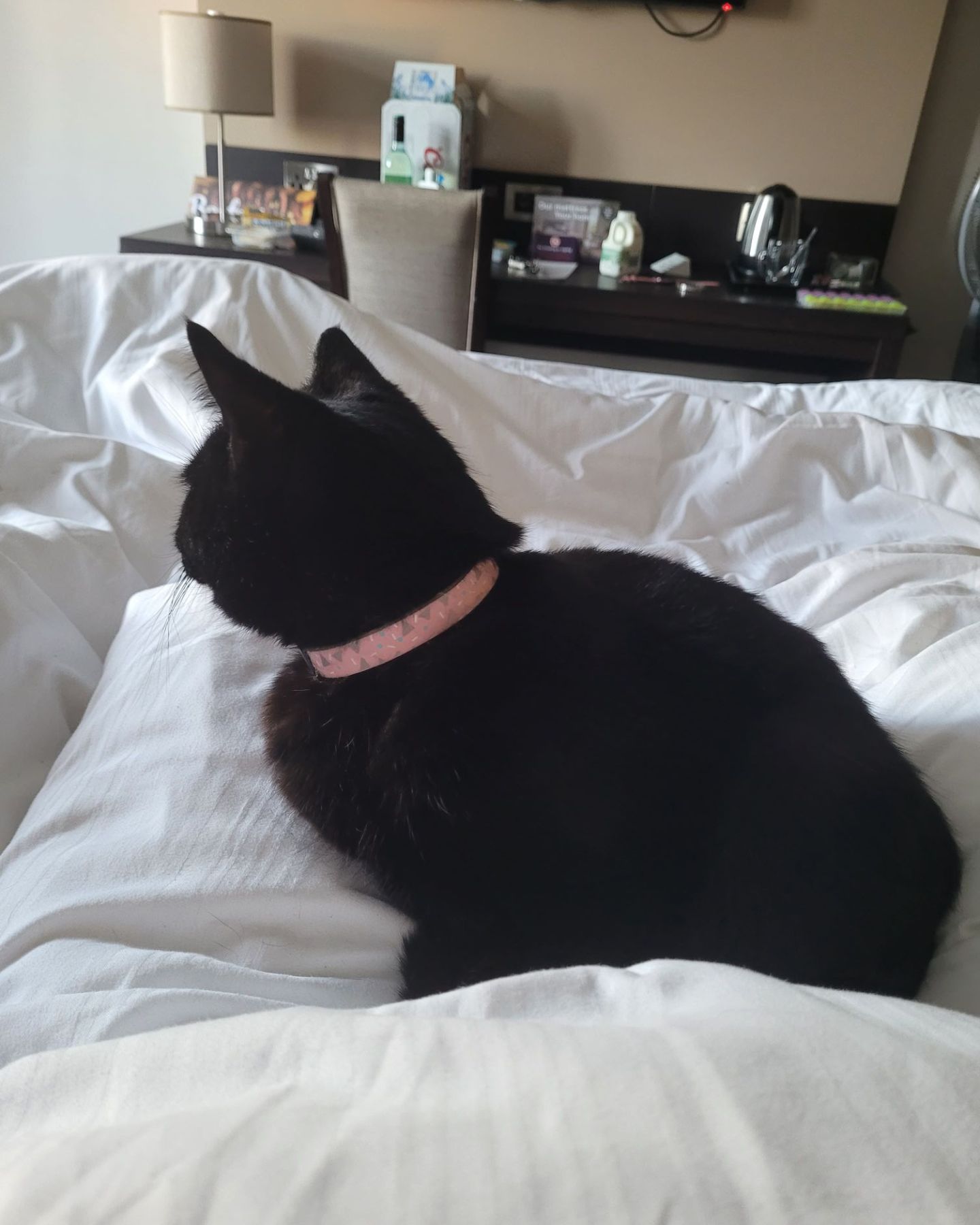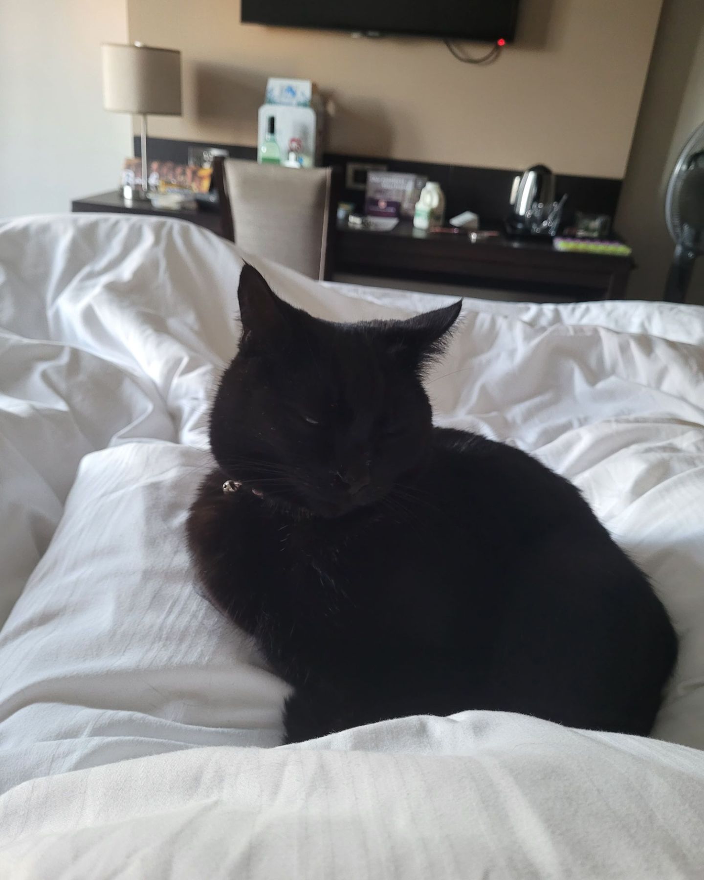 She posted about their furry visitor in a local Facebook group, hoping to find his worried owner before they checked out of the hotel.