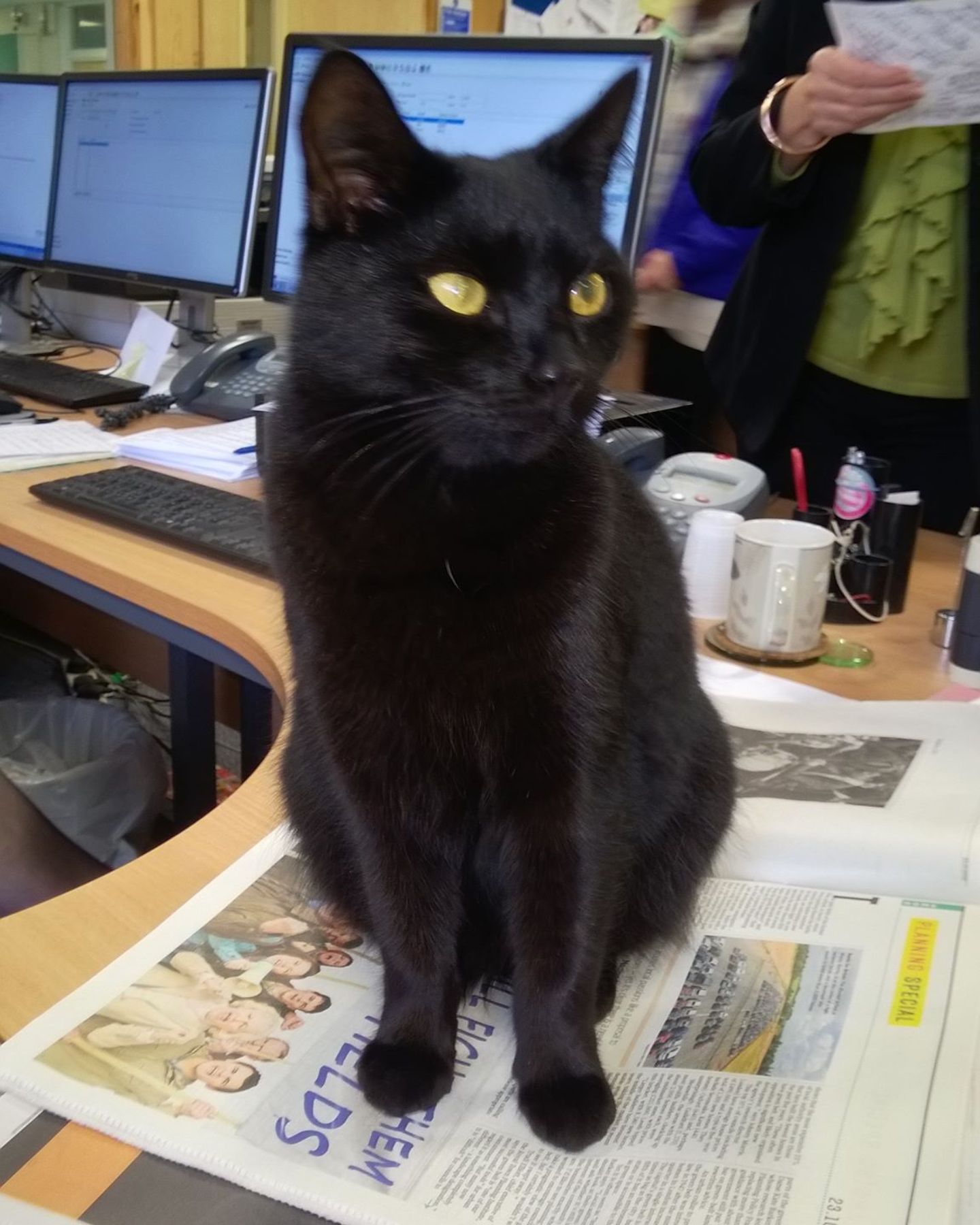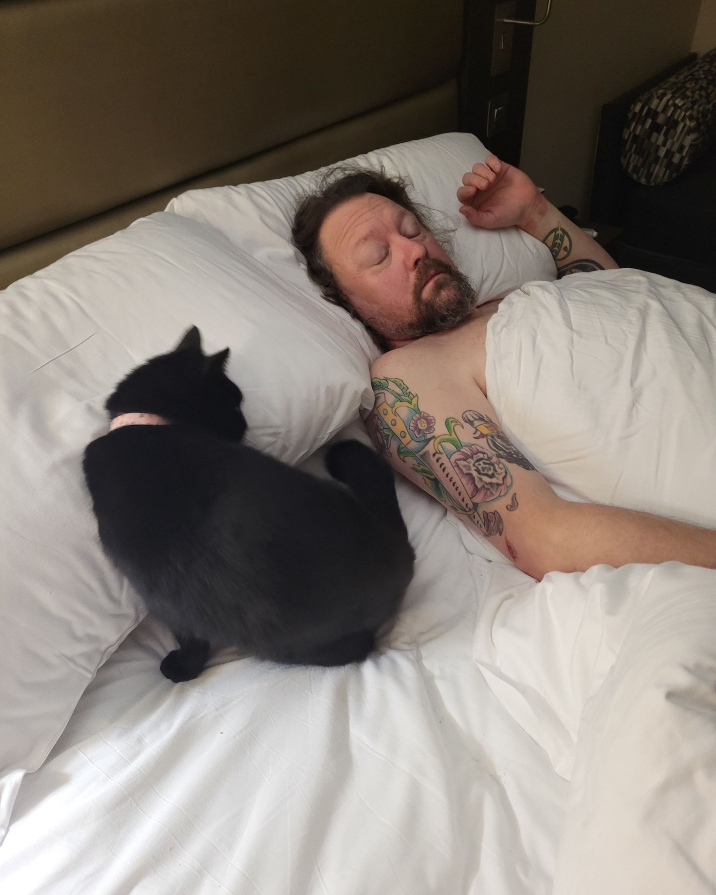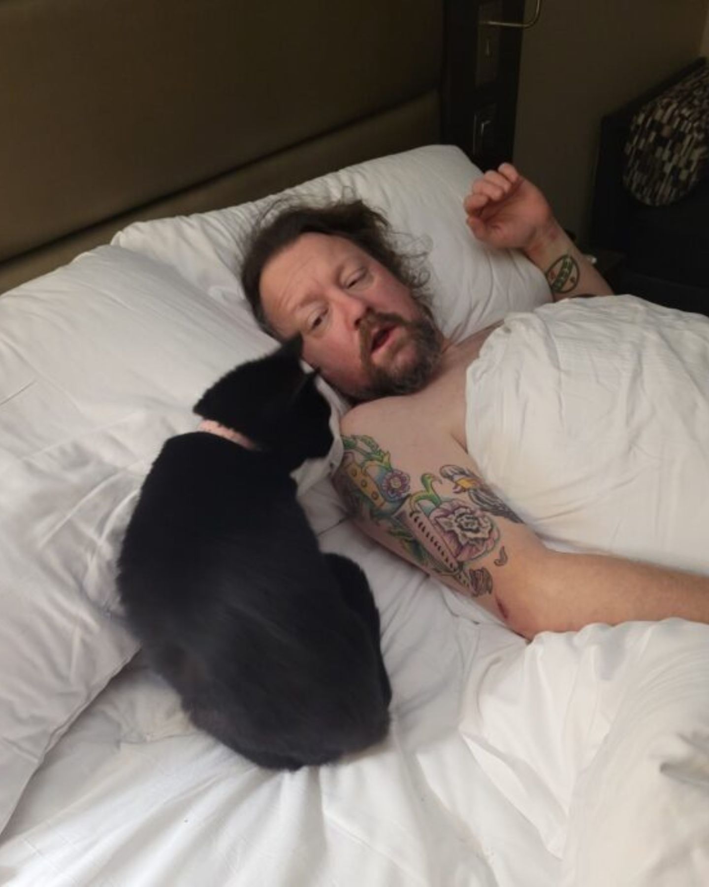 “He was wandering around purring and then jumped onto the bed and walked all over my husband Paul and head bumped him, rubbing his head on Paul’s face.”