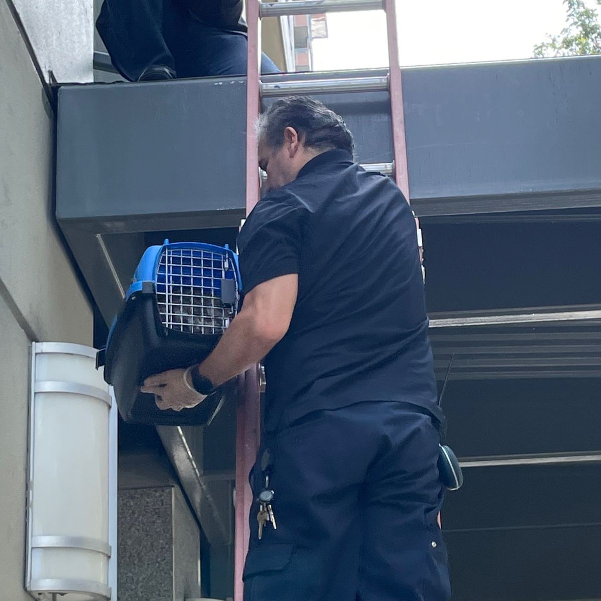 The building manager quickly arrived with a ladder, and together they were able to safely place Mr. Banks into a carrier.
