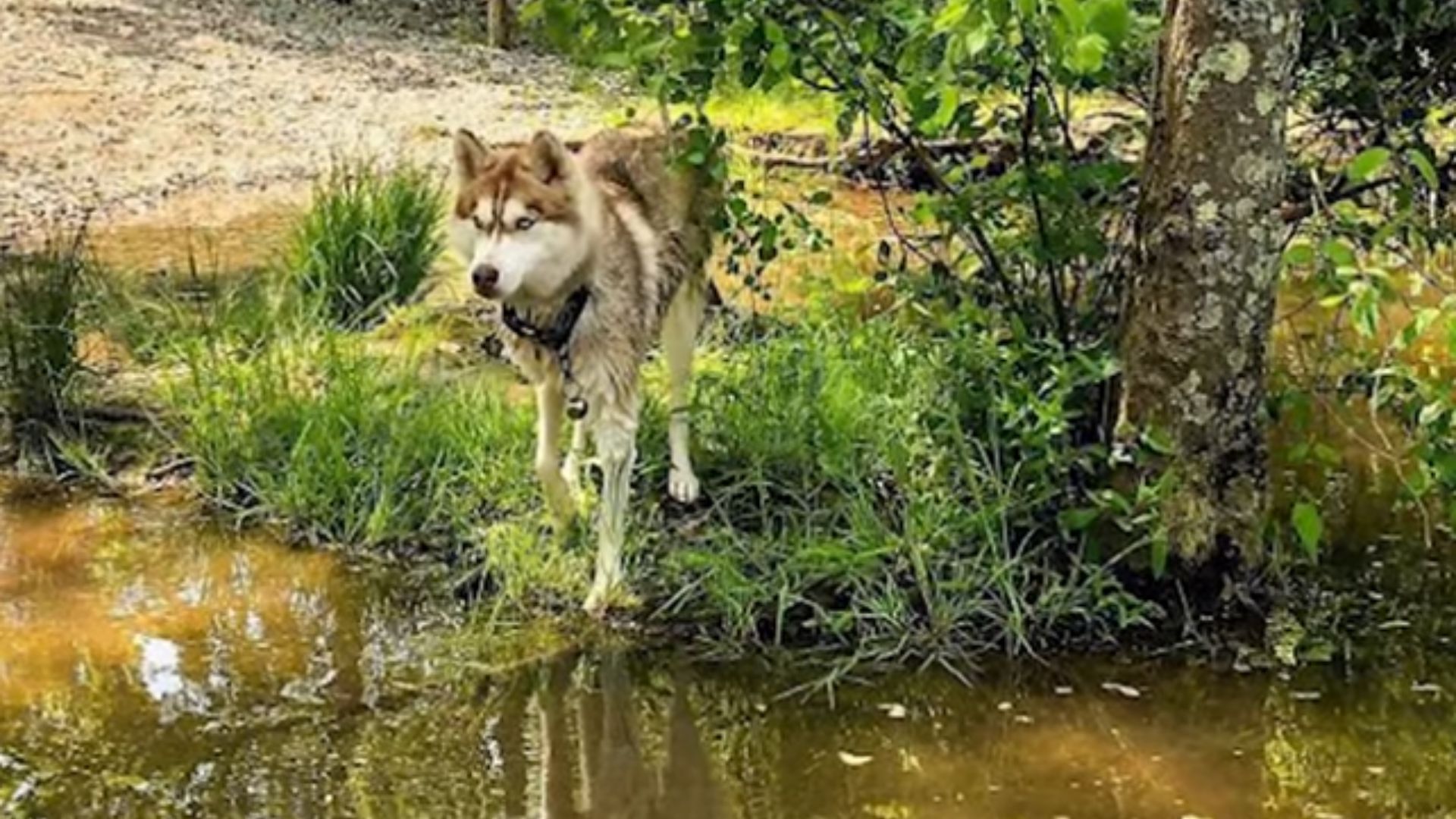 husky next to a pond