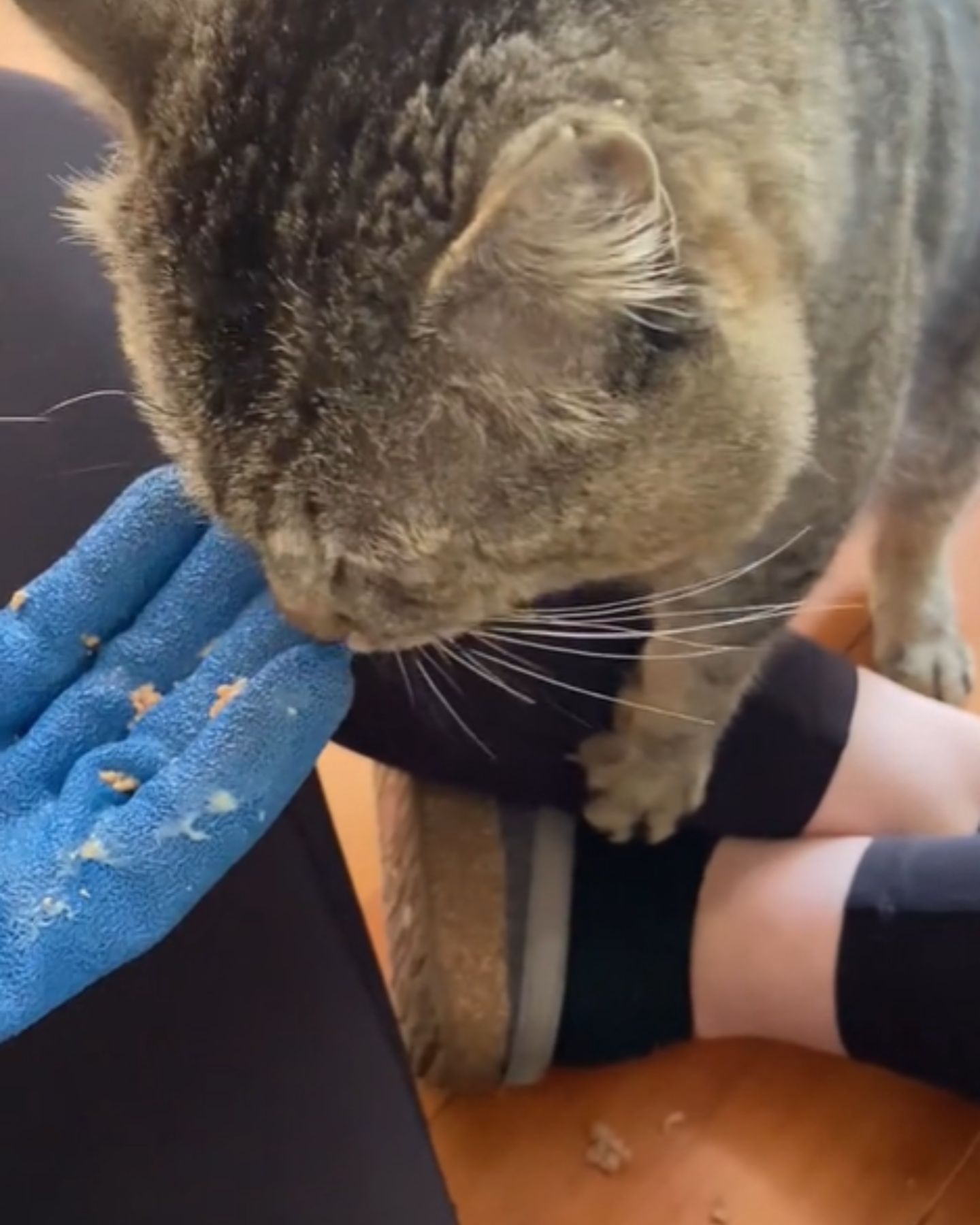“We worked like that, baby steps until he was able to fully eat inside the house. I decided to start feeding him with the spoon. From there, we graduated to a glove to try to get him acclimated to my hands.”