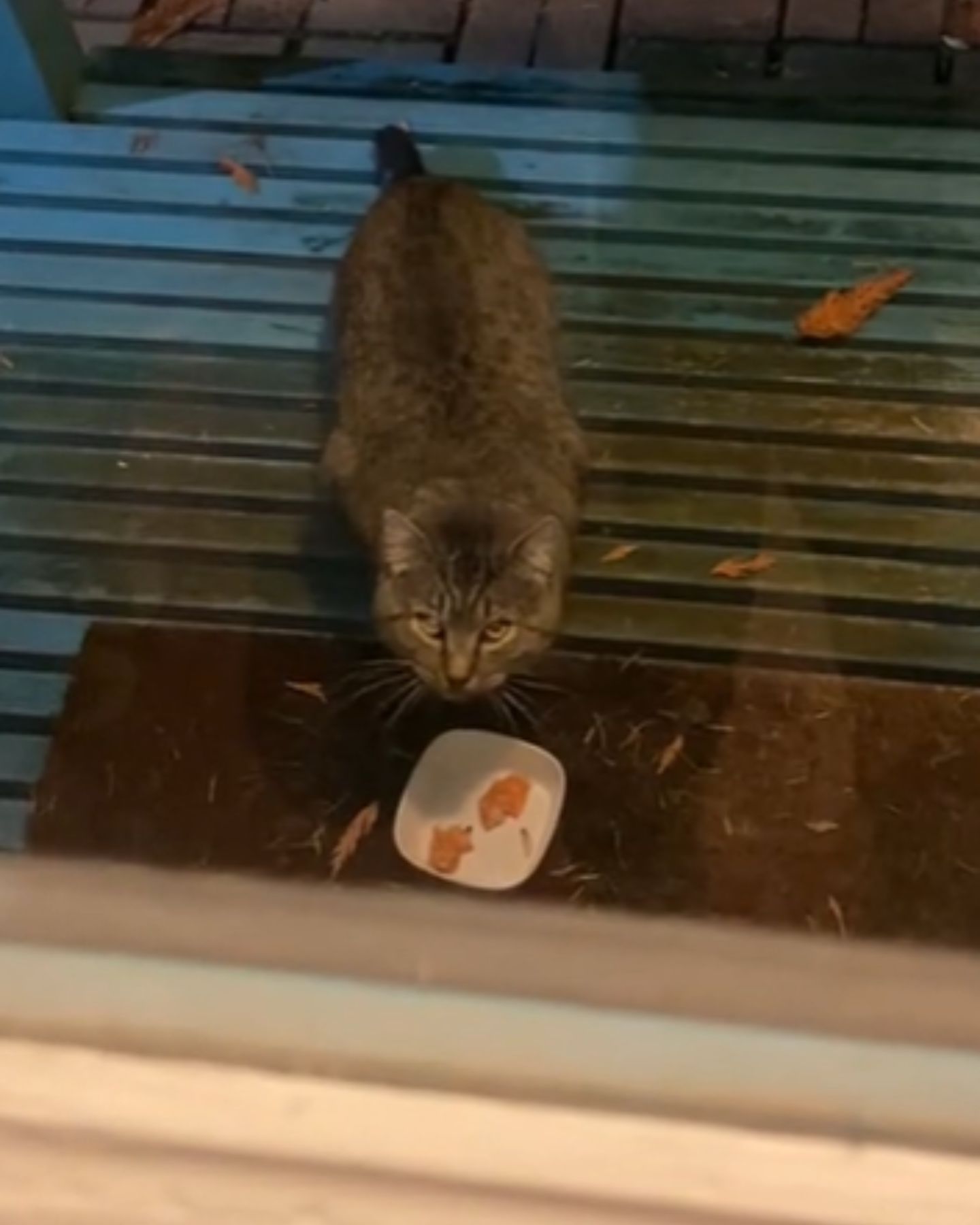 Exactly one year after he first showed up, Sarah finally took the leap. Bruce came inside as usual for his food, and this time she shut the door behind him.